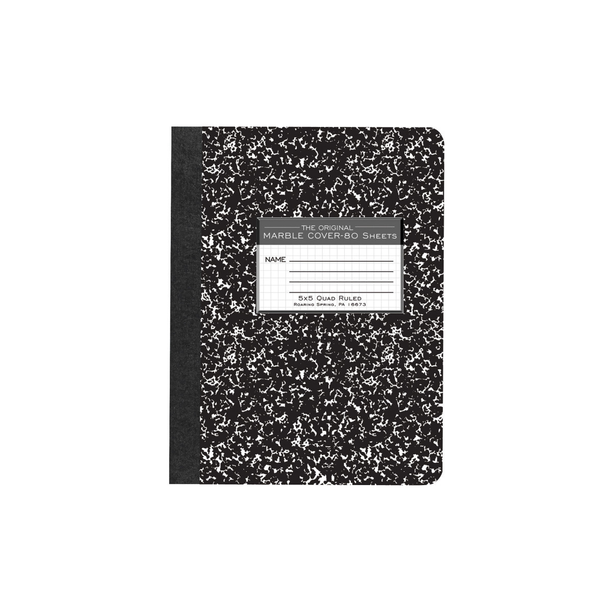 Record your notes in this permanently bound composition book. Paper is smooth 15# writing paper printed with a 5x5 graph grid pattern. Covers are a hard white board that are printed in the traditional black marble pattern. Inside of covers is printed with class schedule and other useful information. Each book is produced with center-sewn and tape bound construction, not designed for sheet tear-out. Sheet size is 9.75" x 7.5" and there are 80 sheets per book. Proudly made in USA!