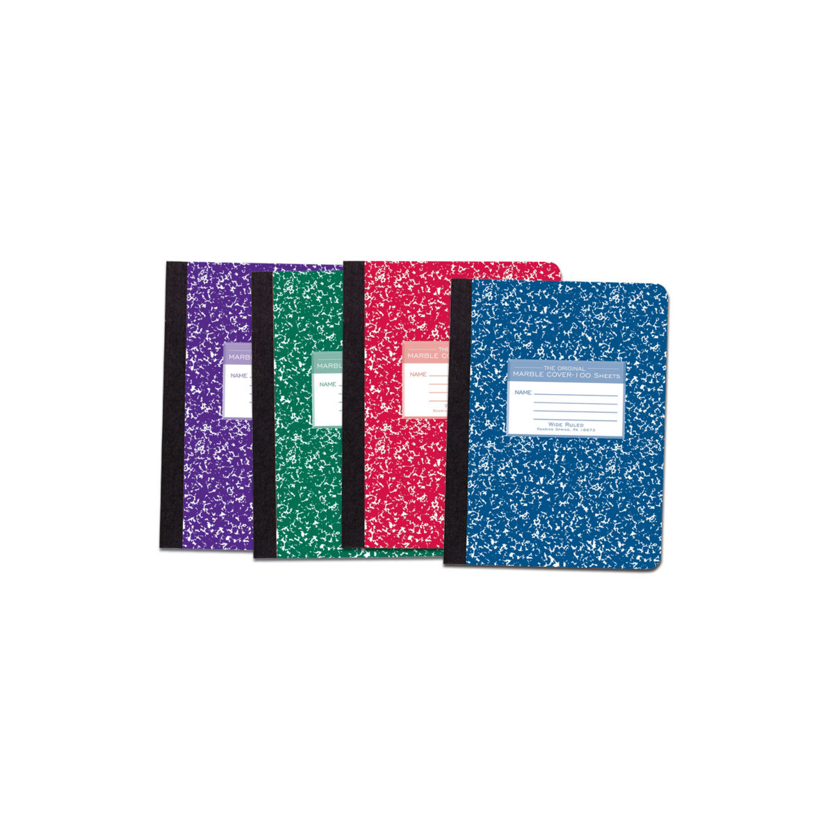 Record your notes in this permanently bound composition book. Paper is smooth 15lb writing paper with wide ruled blue lines and a red margin line. Covers are a hard white board that are printed in the traditional marble pattern in 4 assorted colors (no color choice). Inside of covers is printed with class schedule and other useful information. Each book is produced with center-sewn and tape bound construction, not designed for sheet tear-out. Sheet size is 9.75" x 7.5" and there are 100 sheets per book. Proudly made in USA! Sold as 1 book in assorted colors (no color choice).