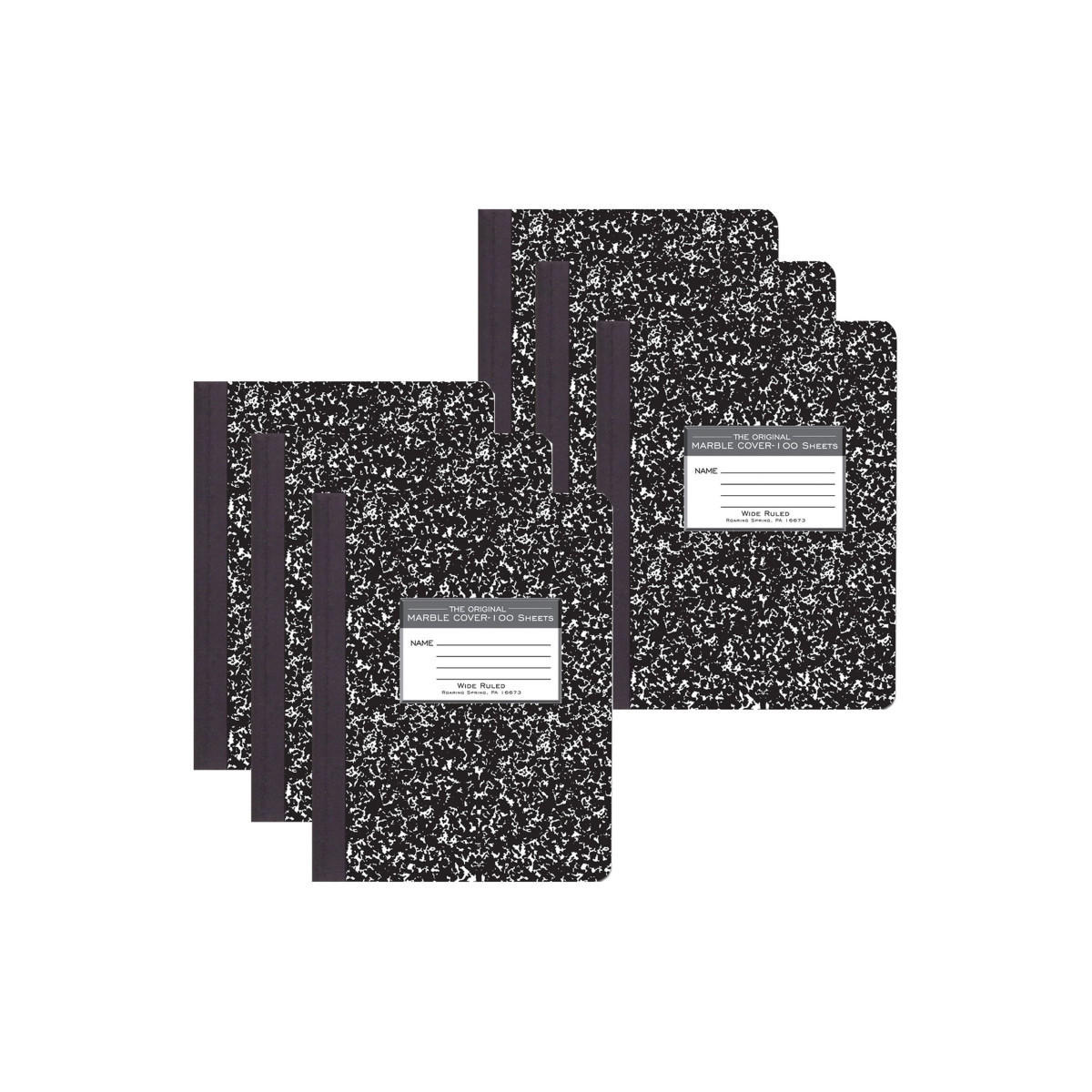 Record your notes in this permanently bound composition book. Paper is smooth 15lb writing paper with wide ruled blue lines and a red margin line. Covers are a hard white board that are printed in the traditional black marble pattern. Inside of covers is printed with class schedule and other useful information. Each book is produced with center-sewn and tape bound construction, not designed for sheet tear-out. Sheet size is 9.75" x 7.5" and there are 100 sheets per book. Sold as a pack of 6 books. Proudly made in USA!
