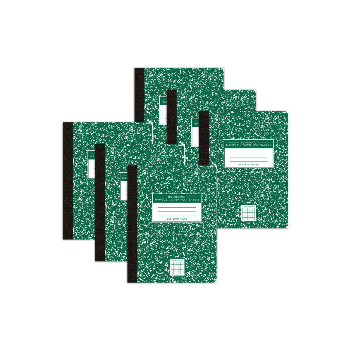 Record your notes in this permanently bound composition book. Paper is smooth 15# writing paper printed with a 5x5 graph grid pattern. Covers are a hard white board that are printed in the traditional green marble pattern. Inside of covers is printed with class schedule and other useful information. Each book is produced with center-sewn and tape bound construction, not designed for sheet tear-out. Sheet size is 9.75" x 7.5" and there are 100 sheets per book. Made in Sri Lanka. Sold as a pack of 6 composition books.
