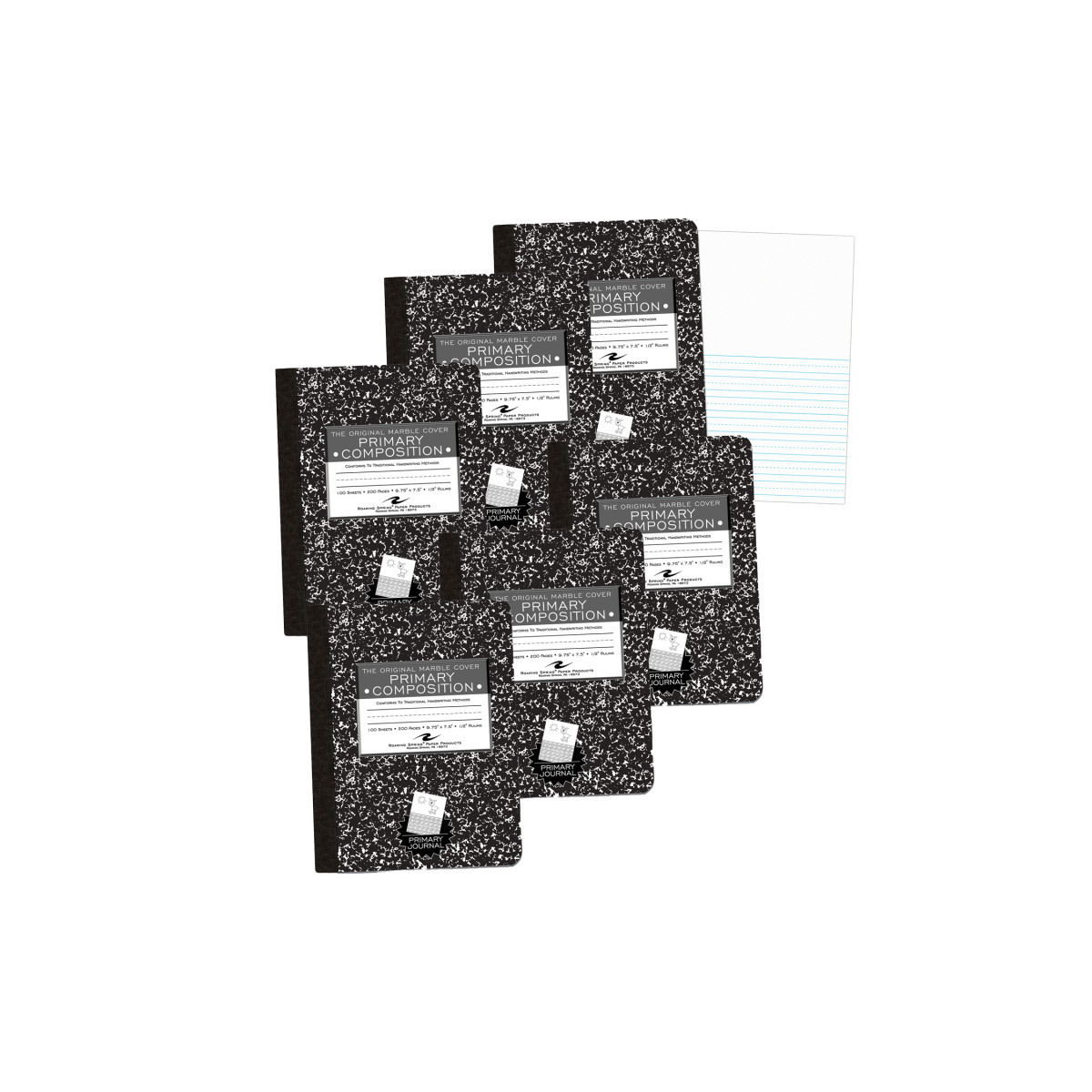 Teach students to use their imagination with this permanently bound composition book. Paper is smooth 15lb. writing paper with a blank upper half of each sheet, and grade 2 skip-line ruling on the bottom half. Design is intended for a sketch on top and a story about the sketch on the bottom Covers are a hard white board that are printed in the traditional black marble pattern. Inside of covers is printed with class schedule and other useful information. Each book is produced with center-sewn and tape bound construction, not designed for sheet tear-out. Sheet size is 9.75" x 7.5" and there are 100 sheets per book. Proudly made in USA! Sold as a pack of 6 books.