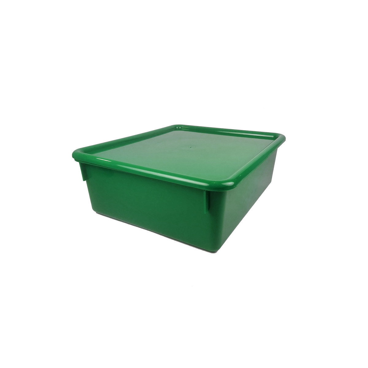 Stow things away with set on lids and stack them high. This tub holds plenty of what you need to store. Great for school or home organization. Made of non-toxic sturdy plastic. Includes lid. Measures 16" x 13-1/2" x 5-1/2".