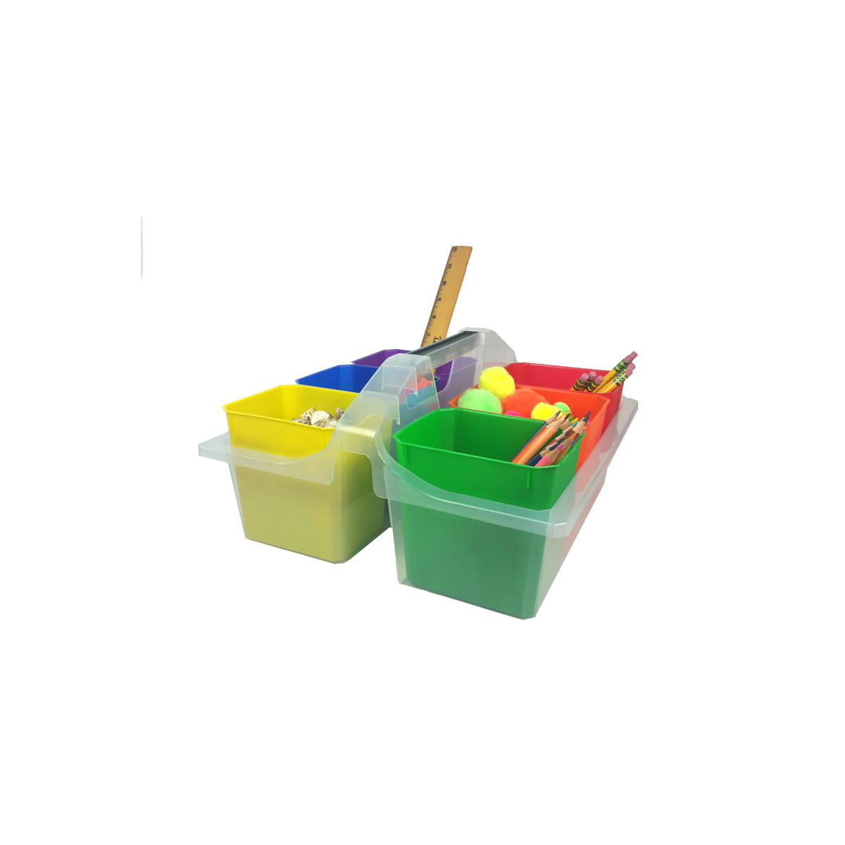 This caddy features 6 large, colorful and removable storage cups! Use the sleek and sturdy caddy to tote around small items, remove the cups at the work station for shared play, and then pop them back in to the caddy for easy clean up! Measures 14" x 13.5" x 7.25".
