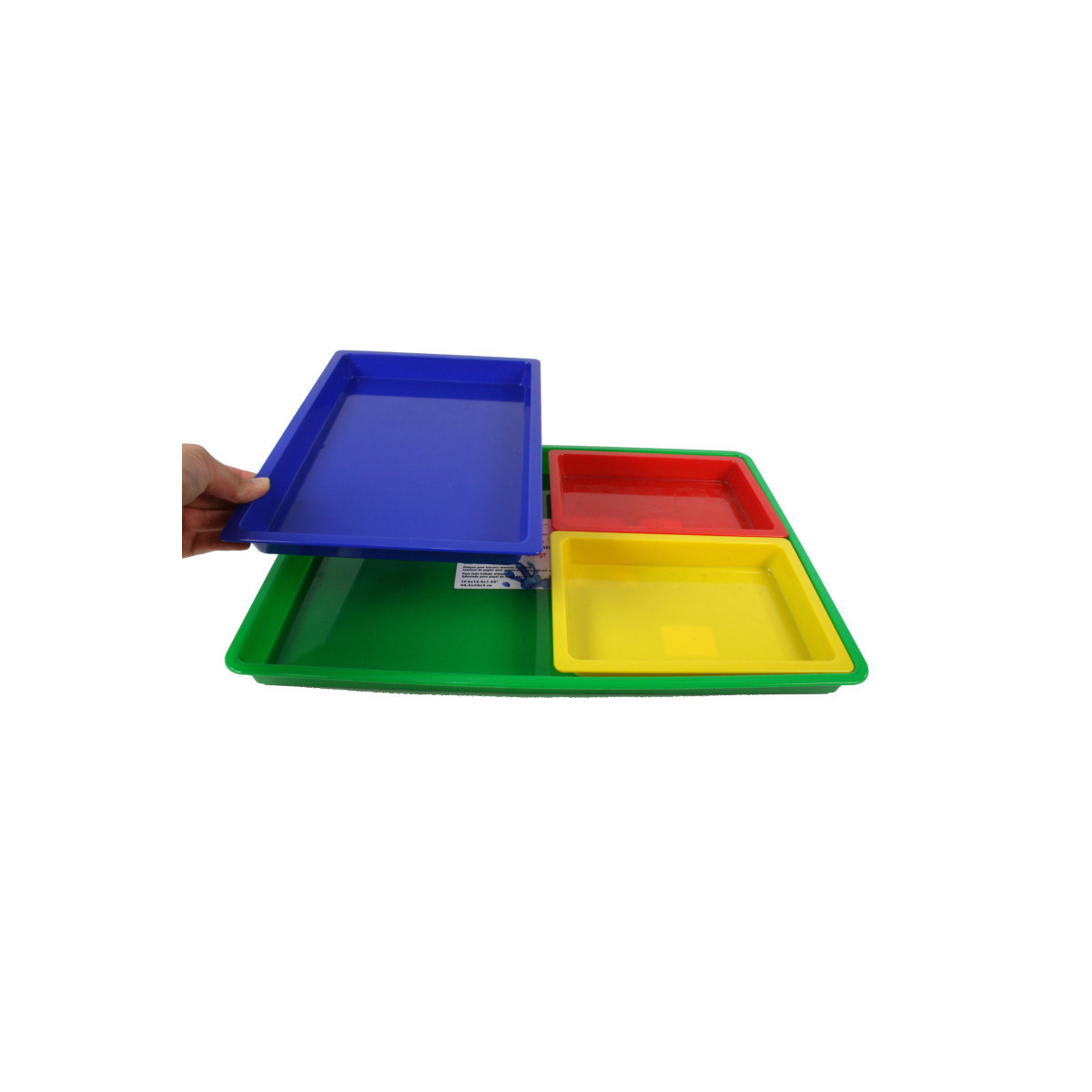 Set features, 1 Large (17-1/2" x 12-1/2" x 1-1/4"), 1 Medium (11-1/2" x 8-1/4" x 1") and 2 Small (8-1/2" x 5-3/4" x 1") trays. Colors vary. Perfect for Arts and Crafts, puzzle sorting, sand play, game play. This set can be split up to house all different craft and art items.