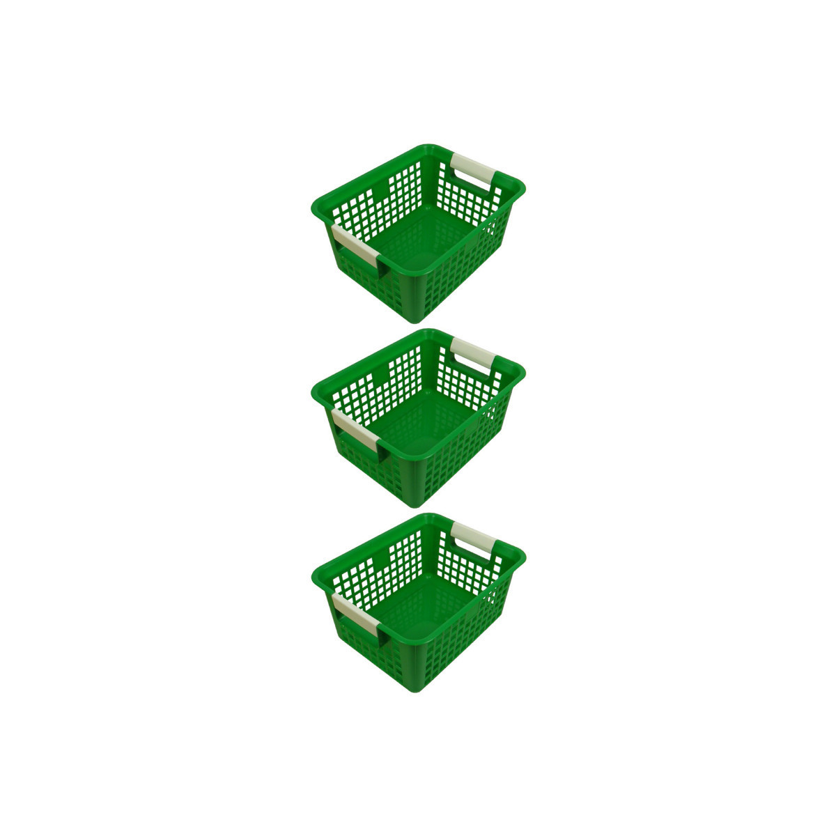 Romanoff Book Basket with carry handles is great for classroom and library storage needs. Includes a label holder built into one handle. Measures 12.25"L x 9.75"W x 6"H. Sold as a pack of 3 baskets.