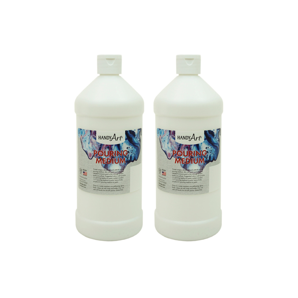 Handy Art® Pouring Medium create unique, vibrant artwork with this acrylic pouring medium. Add pouring medium to transform the consistency of acrylic paint, allowing paint to take on a smooth and fluid form while preserving the vibrant colors. Great for all ages and skill levels. Mix into paint until thin enough to flow easily on surface, suggested ratios included on label. Dries to a water resistant, non-yellowing, gloss finish. Each bottle includes 32 oz. Sold as a pack of 2 bottles.