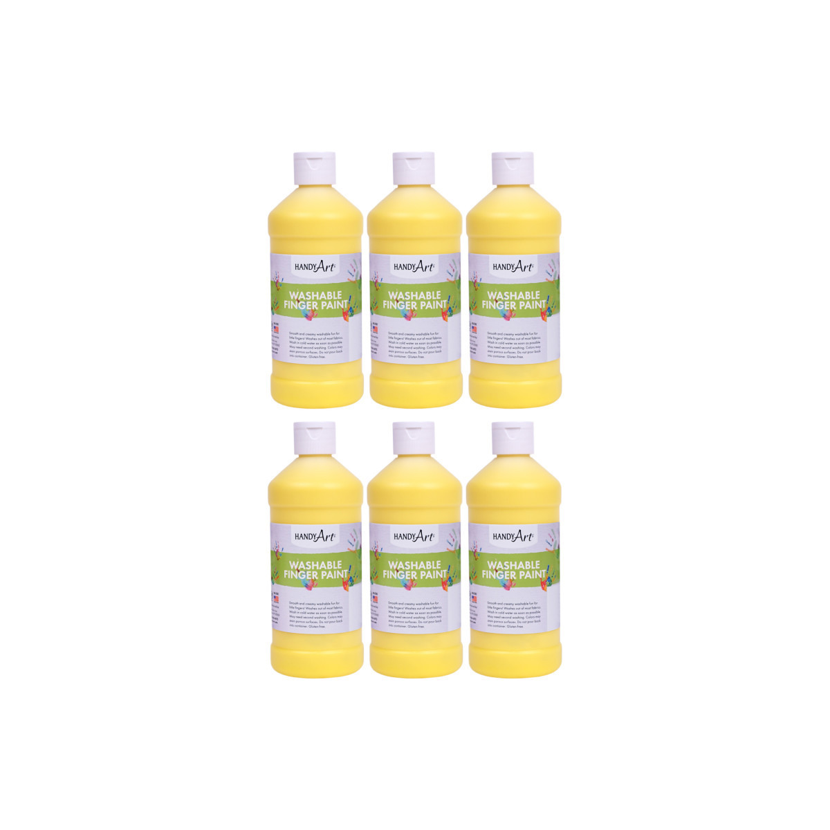 Handy Art® Washable Finger Paint offers vibrant, fast drying color with a smooth and creamy texture. Never have little hands had so much fun and been so clean afterwards! Handy Art® Washable Finger Paints are available in a variety of sizes and colors. Handy Art® Washable Finger Paints are designed to wash out of most clothing with soap and cold water. Handy Art® Washable Finger Paints are certified AP non-toxic. Each bottle is 16 oz. Sold as a pack of 6 bottles.