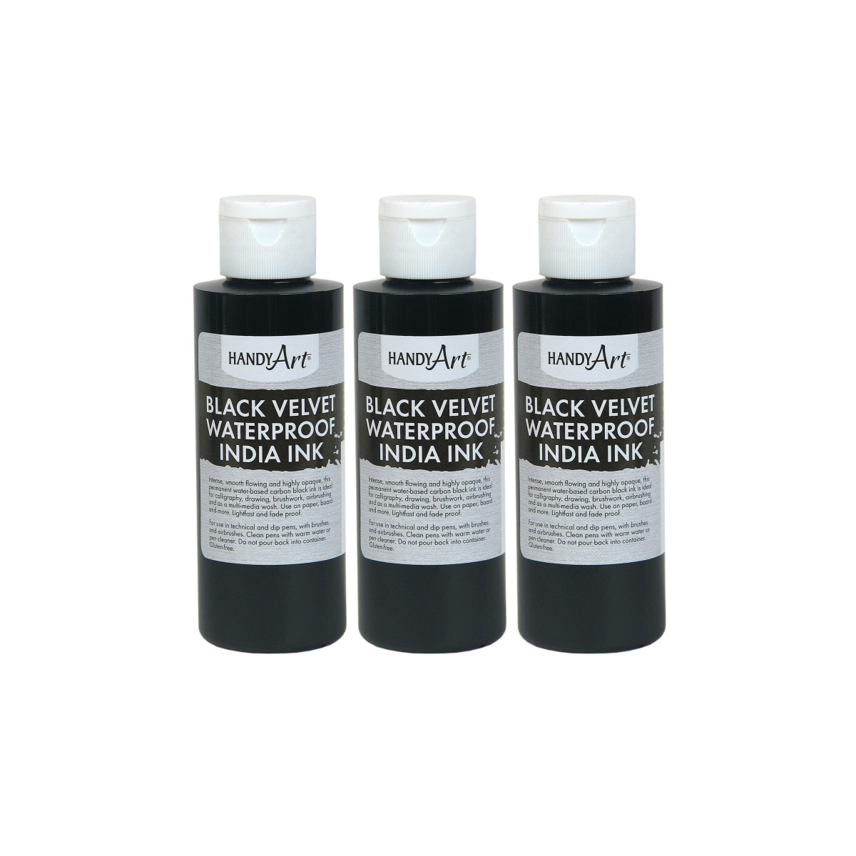 Rich, smooth flowing and highly opaque, this permanent carbon black ink is ideal for calligraphy, drawing, brushwork, airbrushing and as a multimedia wash. For use with technical pens, dip pens, brushes and airbrushes. Lightfast and fade proof. Water based and Certified AP Non-Toxic. Made in the USA. Each bottle includes 4 oz. Sold as a pack of 3 bottles.