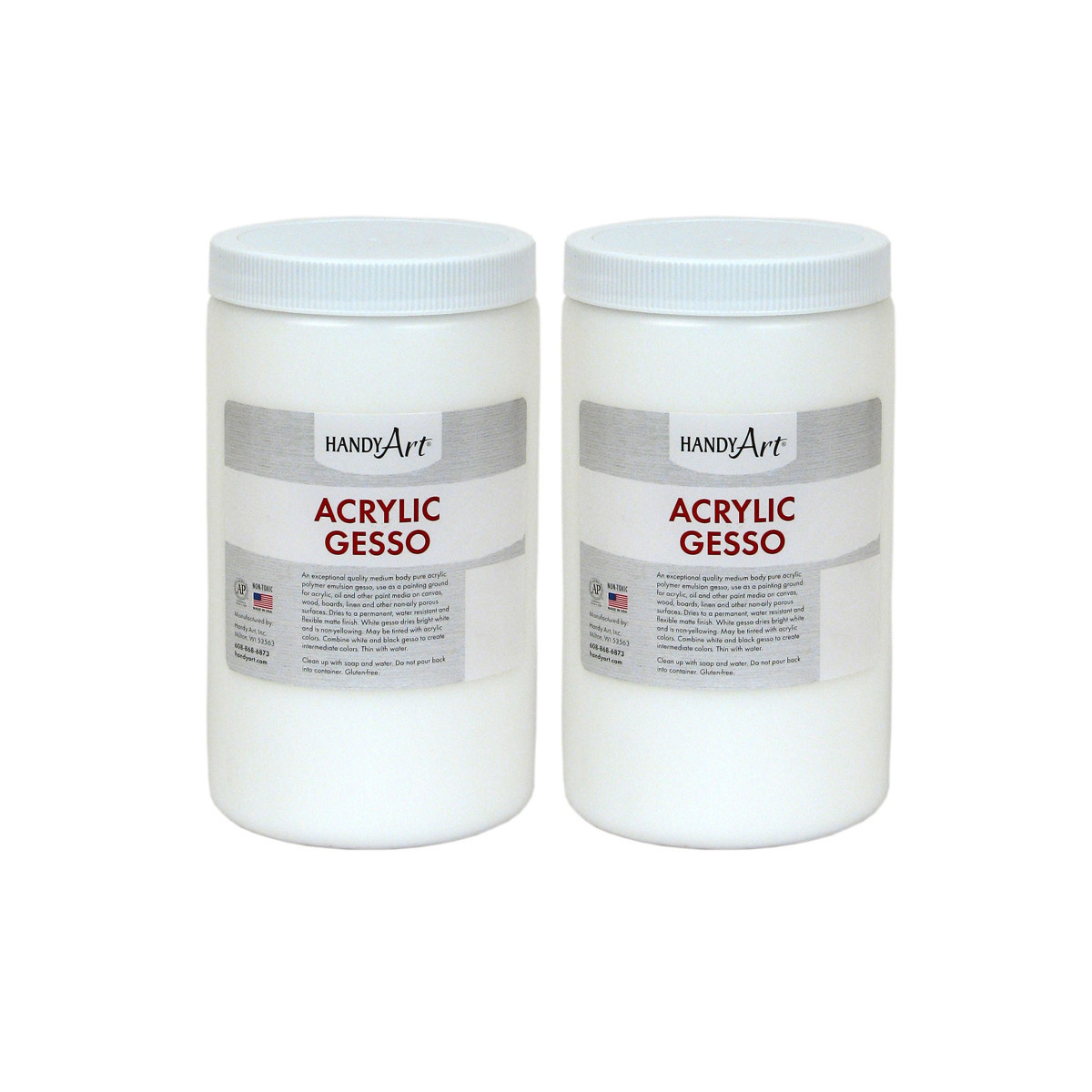 Handy Art® Acrylic White Gesso is an excellent quality student primer that dries to a flexible matte finish. Apply as an undercoating or primer to surface before painting to improve adherence. Clean up with soap and water. Certified AP Non-Toxic. Made in the USA. Each bottle includes 32 oz. Sold as a pack of 2 bottles.