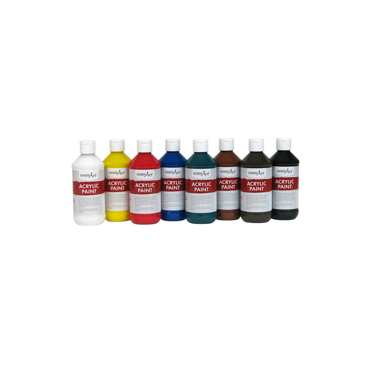 Handy Art® Student Acrylic is a high quality, economical classroom acrylic. This full spectrum of brilliant colors dry to a permanent, water resistant and flexible semi-gloss finish. Can be used on most any surface: paper, fabric, wood, plastic, glass, cardboard, metal and canvas. Set includes 8 ounces each of: Titanium White, Chrome Yellow, Brite Red, Phthalo Blue, Phthalo Green, Burnt Sienna, Raw Umber and Mars Black. Water based and AP Certified non-toxic. Made in USA.