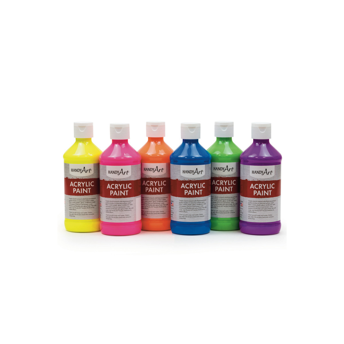 Handy Art® Student Acrylic is a high quality, economical classroom acrylic. This full spectrum of brilliant colors dry to a permanent, water resistant and flexible semi-gloss finish. Can be used on most any surface: paper, fabric, wood, plastic, glass, cardboard, metal and canvas. Water based and AP Certified non-toxic. Made in USA. Each set includes six 8 ounce bottles, 1 each of Fluorescent Yellow, Fluorescent Orange, Fluorescent Pink, Fluorescent Blue, Fluorescent Green and Fluorescent Violet.