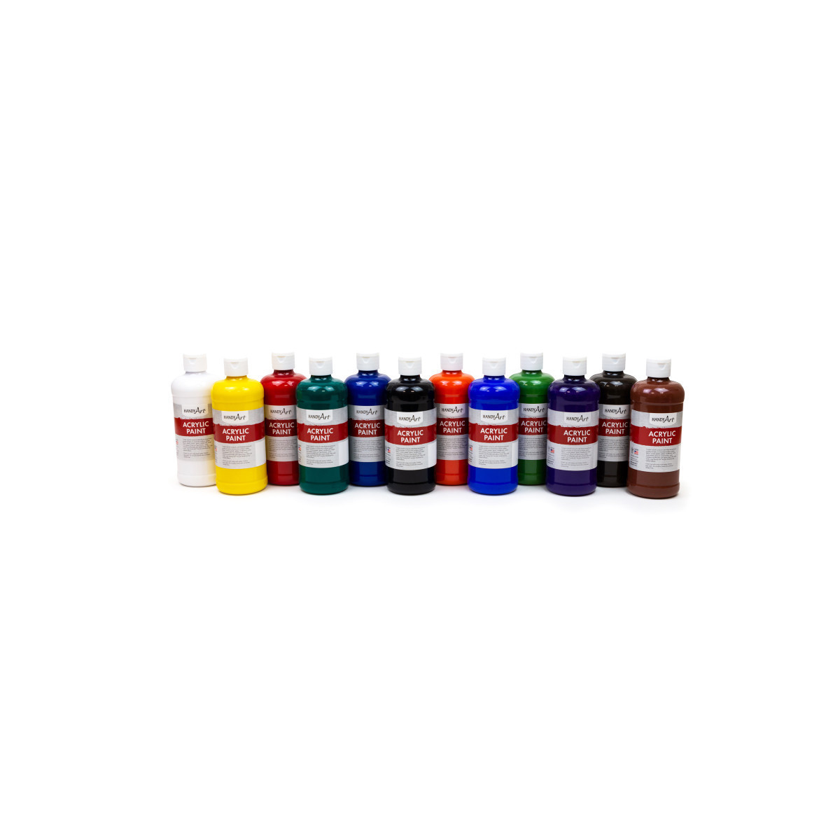 Handy Art® Student Acrylic is a high quality, economical classroom acrylic. This full spectrum of brilliant colors dry to a permanent, water resistant and flexible semi-gloss finish. Can be used on most any surface: paper, fabric, wood, plastic, glass, cardboard, metal and canvas. Water based and AP Certified non-toxic. Made in USA. Each set includes 12 colors: Titanium White, Chrome Yellow, Chrome Orange, Vermilion, Brite Red, Ultra Blue, Green Oxide, Phthalo Green, Violet, Burnt Sienna, Raw Umber and Mars Black.