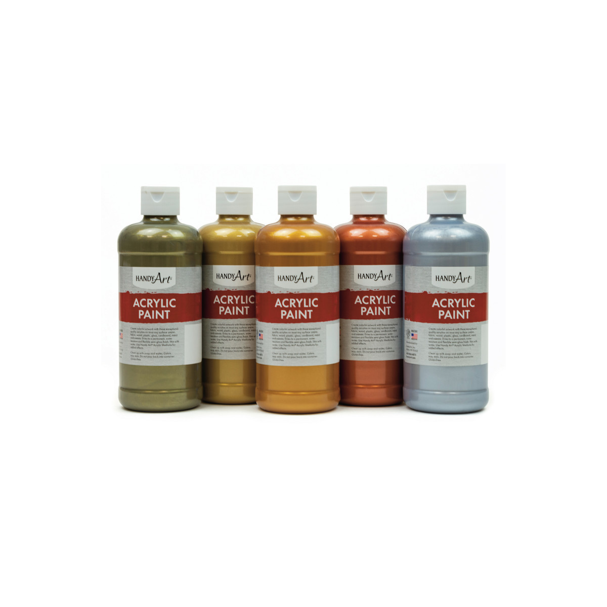 Handy Art® Student Acrylic is a high quality, economical classroom acrylic. This full spectrum of brilliant colors dry to a permanent, water resistant and flexible semi-gloss finish. Can be used on most any surface: paper, fabric, wood, plastic, glass, cardboard, metal and canvas. Water based and AP Certified non-toxic. Made in USA. Each set includes 5 bottles, 16 oz. each.
