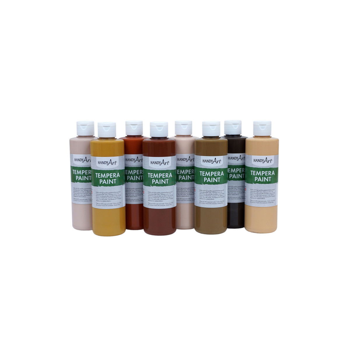 A great economical source of color, Handy Art tempera offers rich skin tones. Made with high quality pigments that dry to a matte finish that won't chip, flake or crack. Highly opaque colors offer excellent coverage. Clean up with soap and water. Certified AP Non-Toxic. Made in the USA. Set of 8 - 8 oz. bottles.