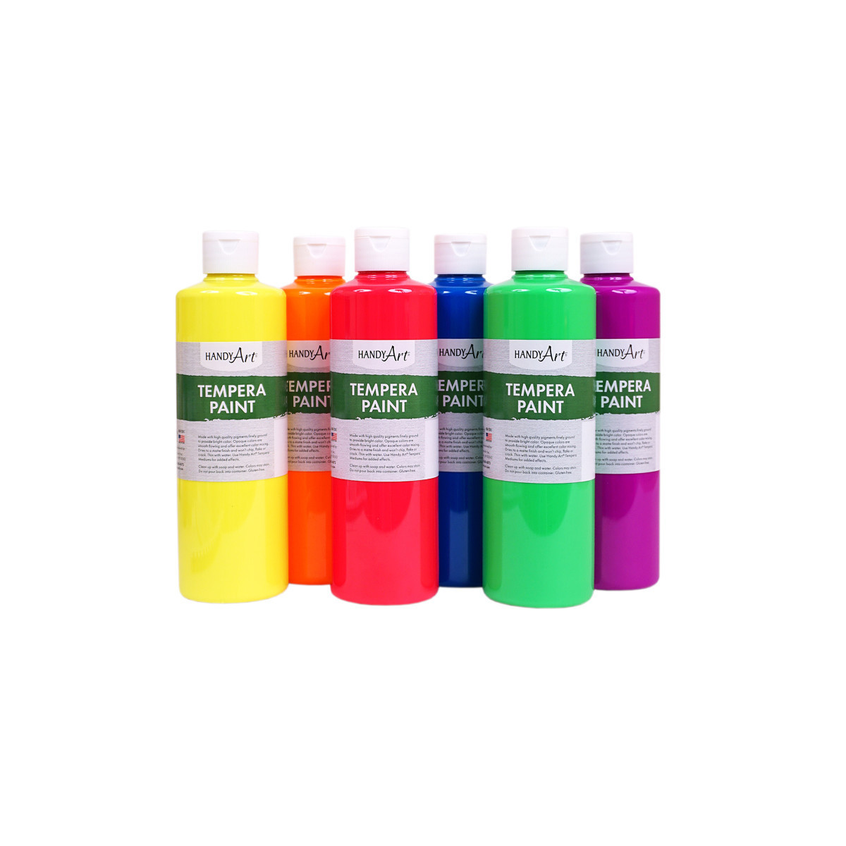 Handy Art® Fluorescent Tempera Paint offers excellent opacity and coverage and adds a luminous neon gleam on art, craft and school projects! These creamy temperas can be used on surfaces such as paper, poster board, cardboard, wood and papier-mâché. Paint dries to a matte finish and won't chip, flake or crack when dry. Paint is non-toxic, water based and gluten-free and cleans up easily with soap and water. Made in the USA. Certified AP Non-Toxic. Set includes a pint each of: Fluorescent Yellow, Fluorescent Orange, Fluorescent Hot Pink, Fluorescent Blue, Fluorescent Green, and Fluorescent Violet.