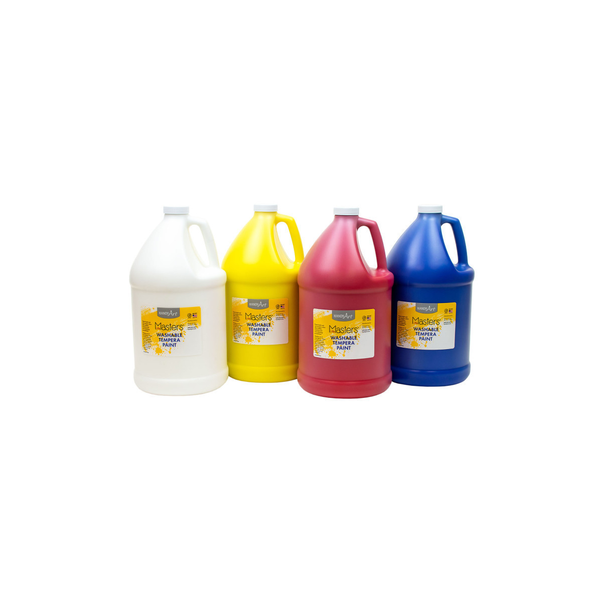 A fine quality and economical paint, a great combination for the beginning artist! Opaque blendable colors are bright and rich and won't chip, flake or crack when dry. Washes out of most fabrics with soap and cold water. Certified AP Non-Toxic. Made in the USA. Each kit includes 1 gallon each of 4 colors: White, Yellow, Red and Blue.