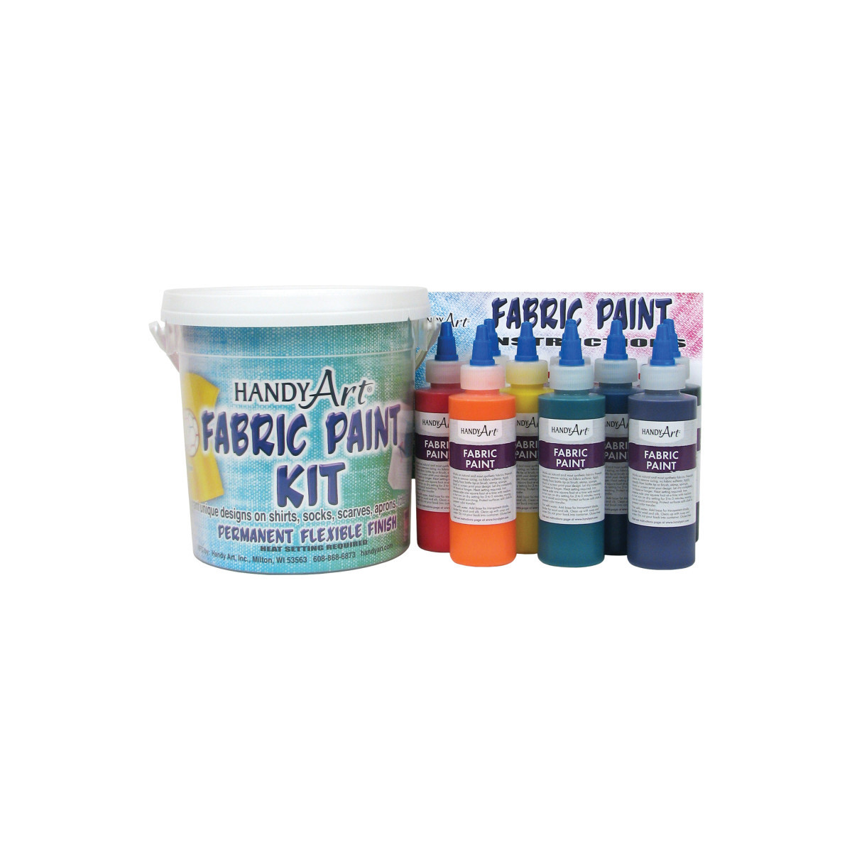 Handy Art® Fabric Paint opens up endless possibilities of creativity on all your fabric projects. Works on natural and most synthetic fabrics and can be applied directly from bottle tip or brush, stamp, sponge, block or screen printed. Dries to a soft, flexible finish. Heat setting with an iron is required for a permanent and washable finish. Handy Art® Fabric Paint is certified AP non-toxic. Set of 9 - 4 oz. bottles in assorted. Store in the handy bucket provided.