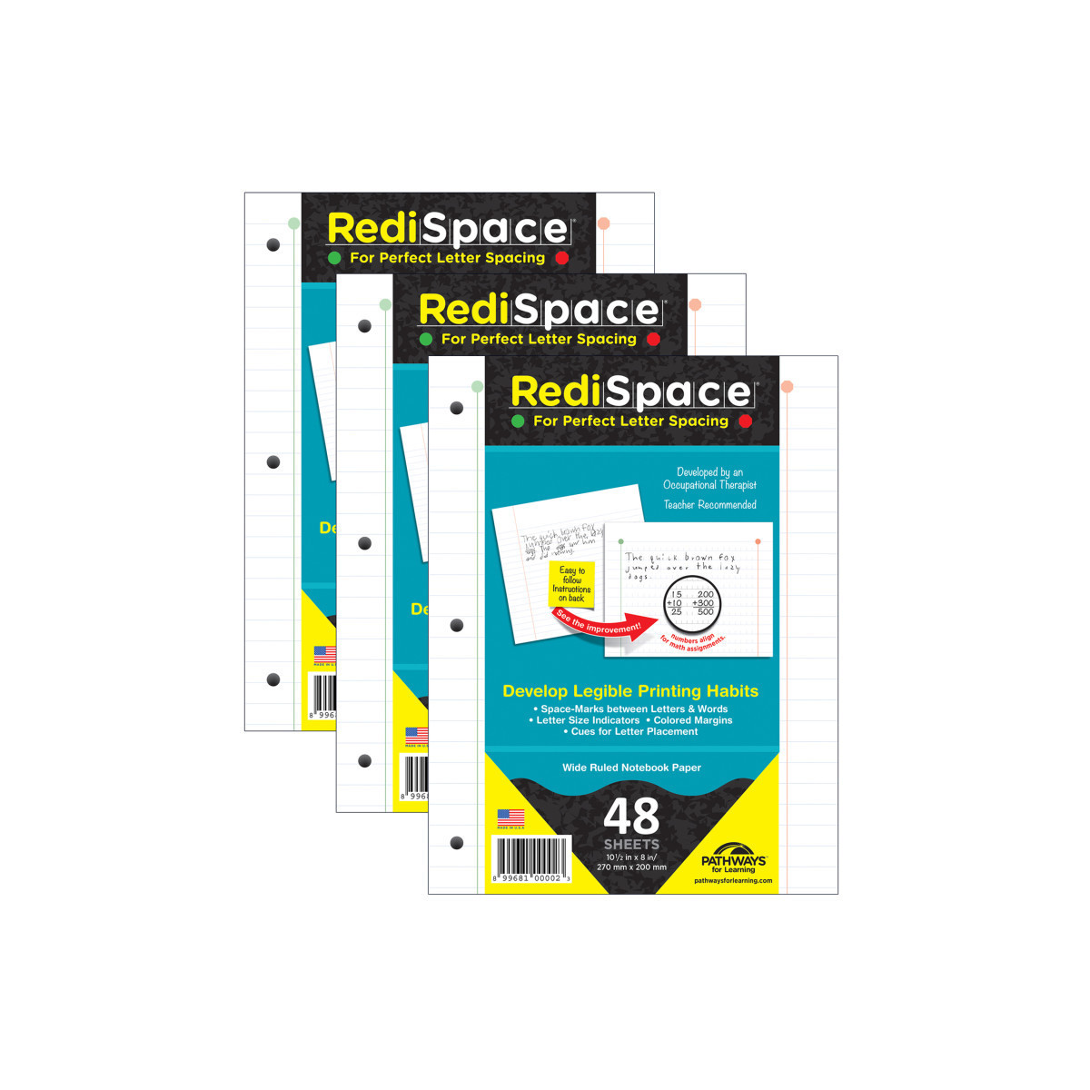 This patented legibility paper was designed and tested by occupational therapists who specialize in handwriting. RediSpace helps students write more neatly by using innovative cues for proper spacing between letters and words, correct letter size, and appropriate alignment of letters on the lines. Teachers LOVE RediSpace because they can read their student's handwriting and fewer errors occur in math due to number misalignment. Wide ruled. Includes 48 sheets. Measures 10.5" x 8.5". Sold as 3 packs for a total of 144 sheets.