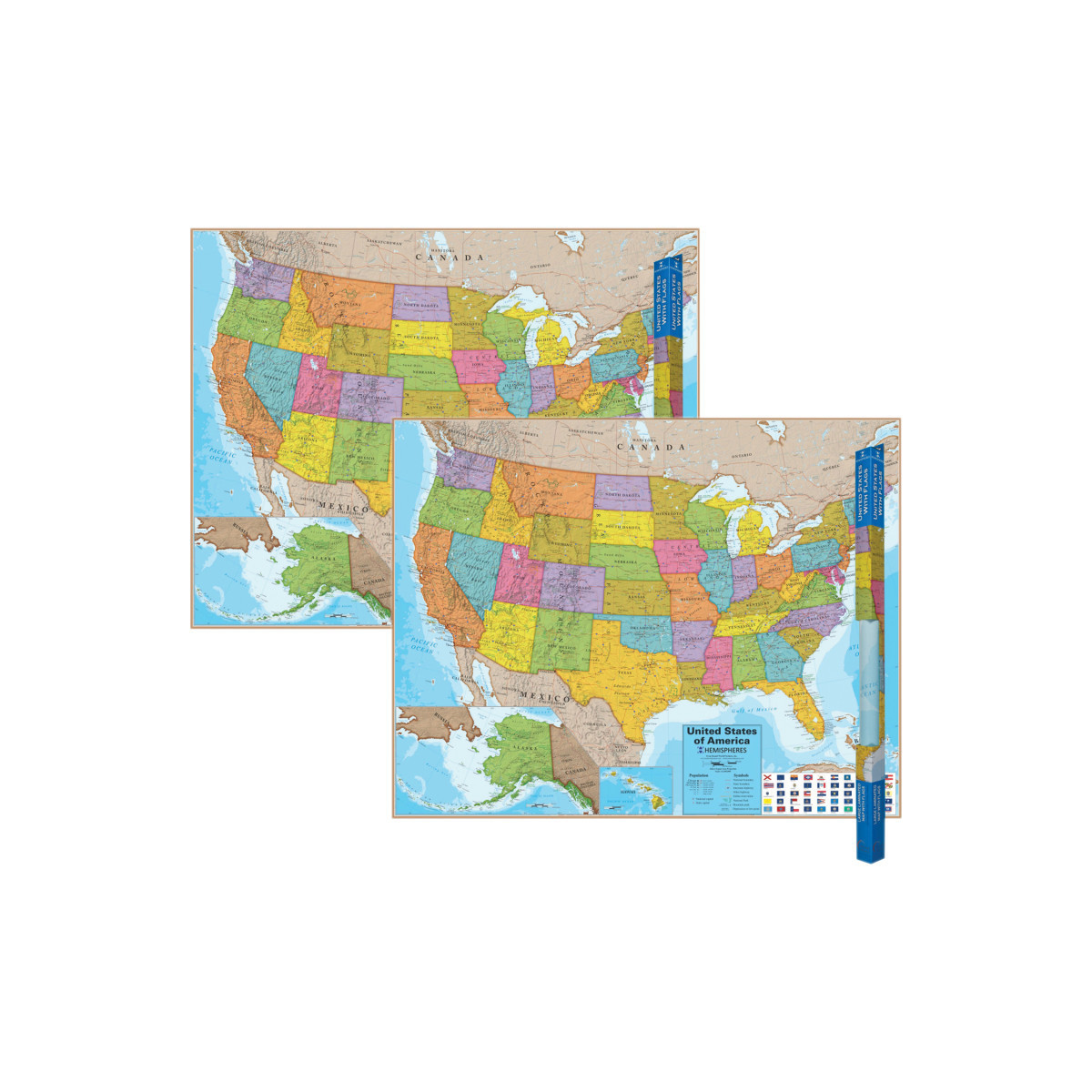 This popular Hemispheres United States map is laminated, measures 38" x 48" and is widely used. It shows capitals, cities, populations, and major interstates. Sold as a pack of 2 maps.