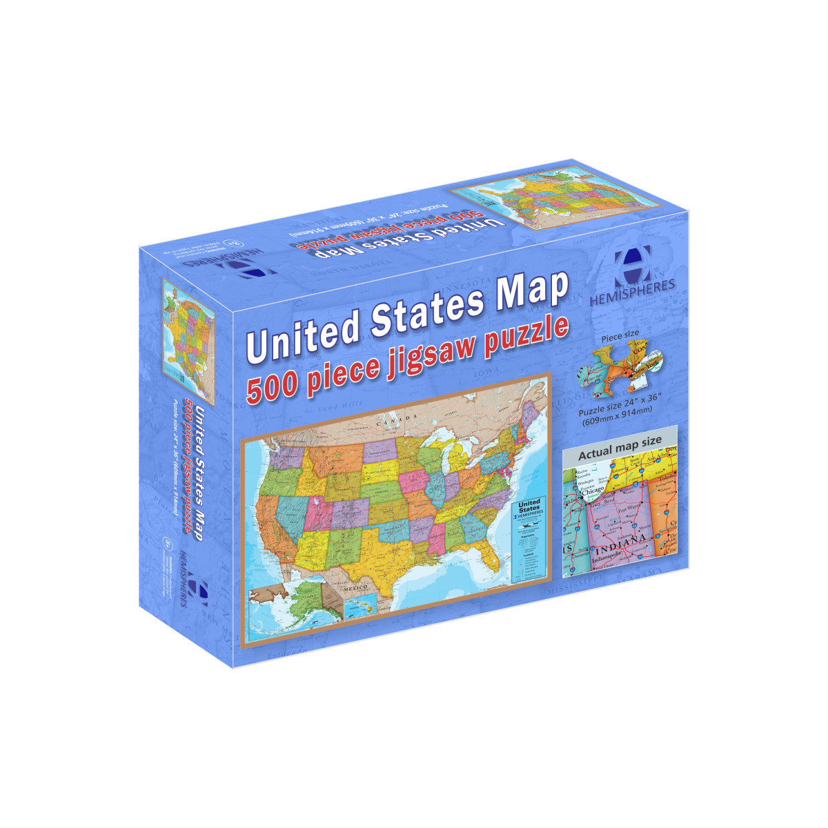 The 500 piece USA Puzzle is full of details of all 50 states. It is a fun family activity to colorful puzzle together. Comes in a sturdy box and measures 24" x 36". Ages 8+.
