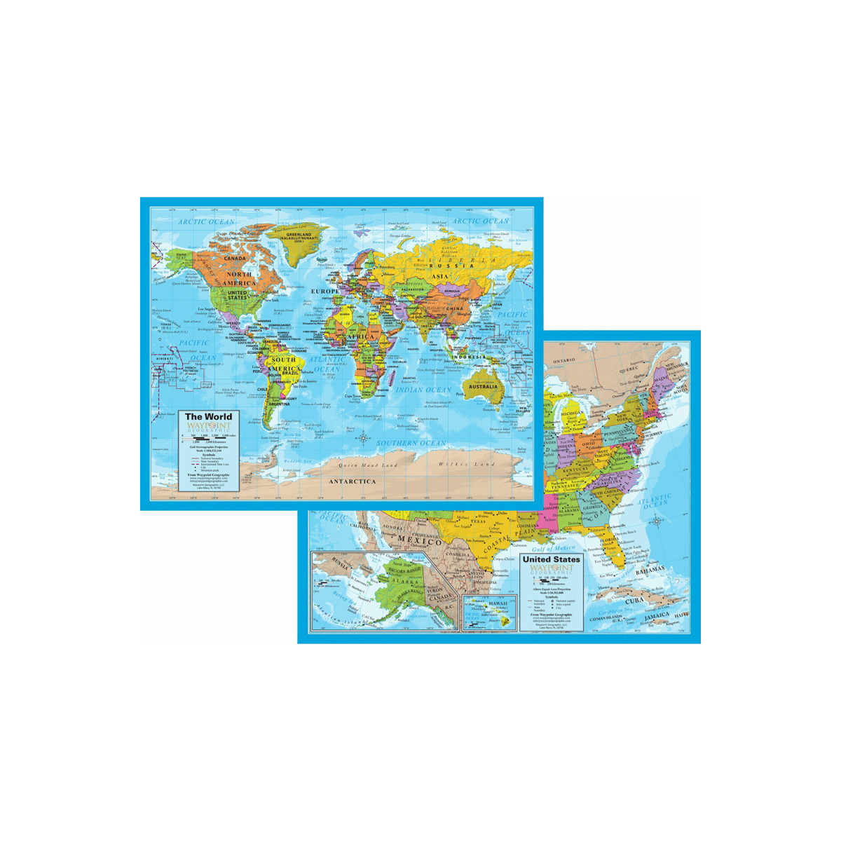 World/USA Laminated Notebook map set includes 32 notebook maps measuring 8.5" x 11". Can be used in a standard 3-ring binder. Makes easy reference for continents, countries, states and major World and USA cities and other points of interest.
