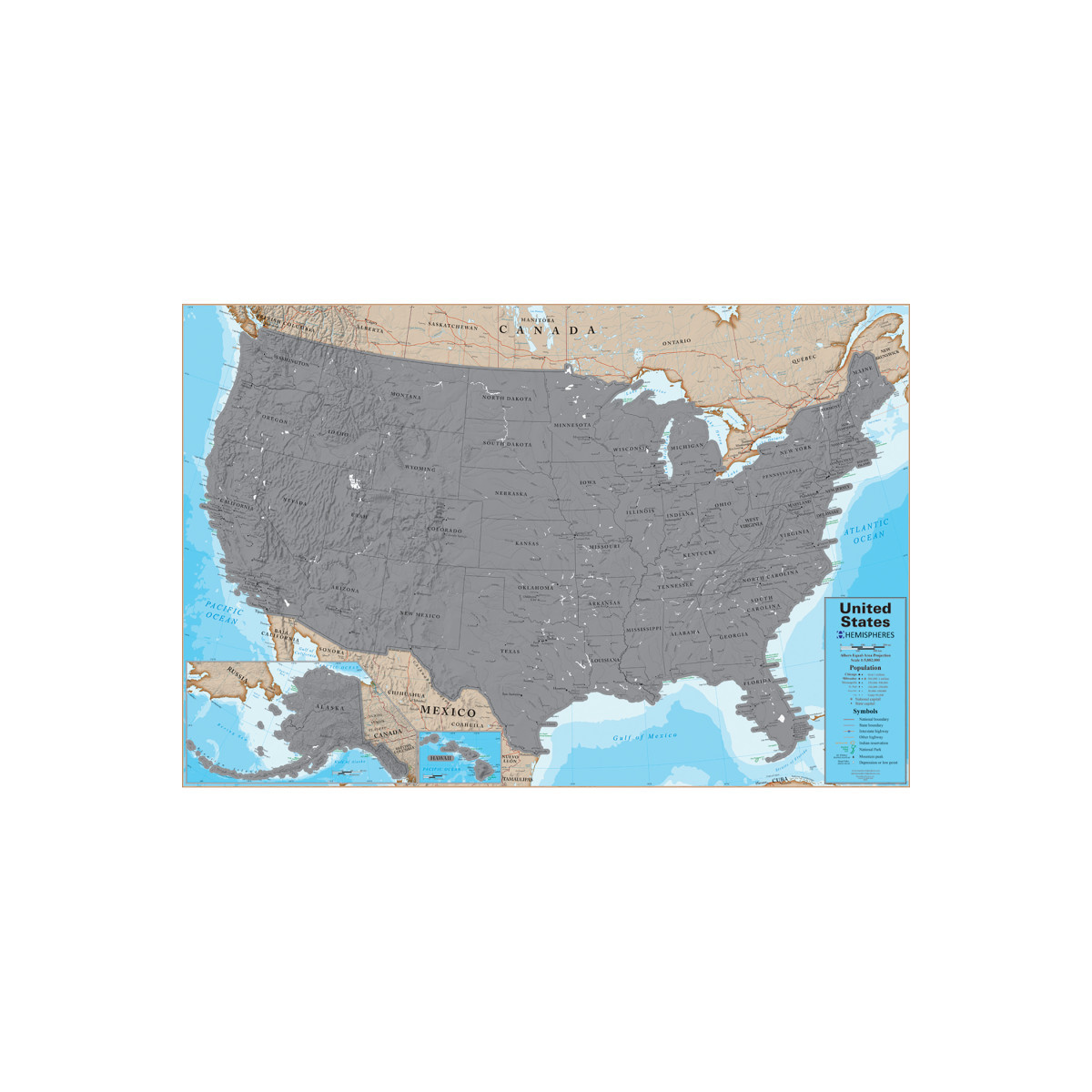 Commemorative your travels or other destination needs by scratching off the top layer above the land masses with this attractive wall map. Underneath is a 24" x 36" blue ocean wall map which is great for room or office décor. It has up to day cartography and is laminated for durability and dry erase marker use. Makes a great educational and reference geography tool. Great for mounting and framing!