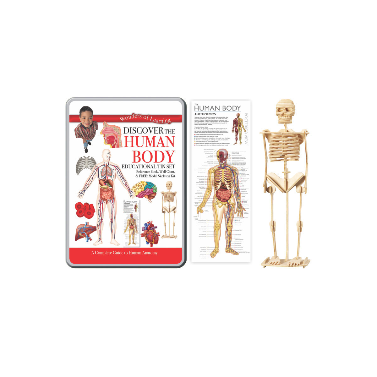 This Human Body tin set contains a detailed 32 page reference book, an educational wall chart, and a skeleton model kit. Fun ways to discover and explore the world around us!