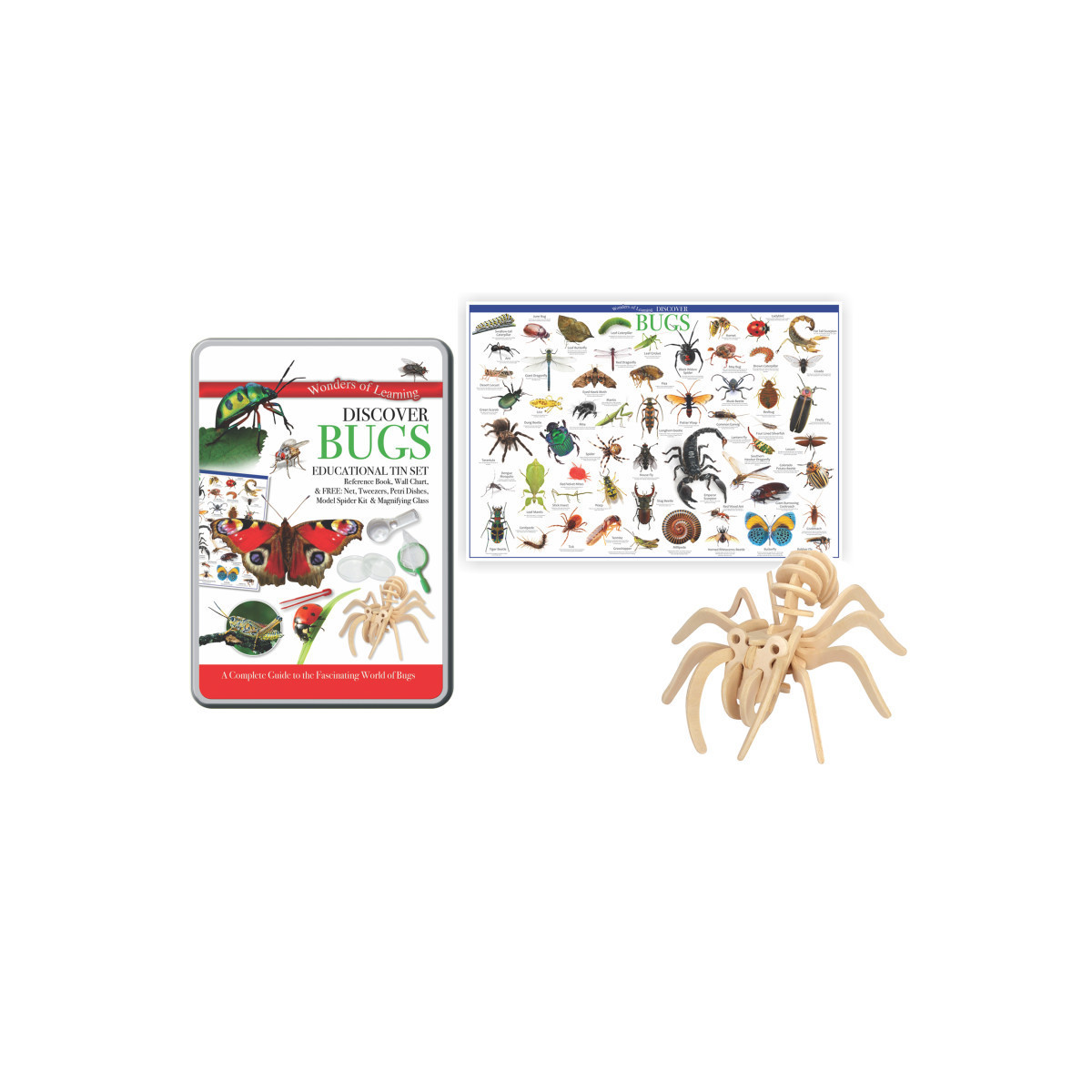 This Bugs tin set contains a detailed 32 page reference book, an educational wall chart, and a spider model kit. Fun ways to discover and explore the world around us!