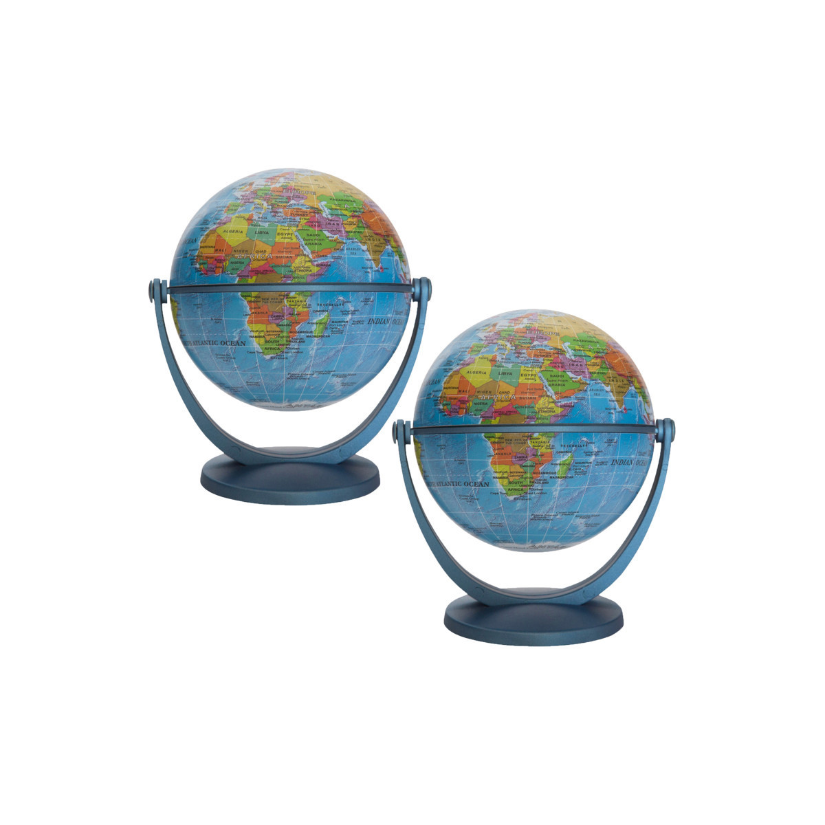 The political blue ocean GyroGlobe is a 4-inch, compact, multi-directional globe with over 600 named places. With it's swivel and tilt technology, the globe can be easily rotated in all directions, and is supported by an elegant, highly stable base. The globe's total height is 5.3 inches.