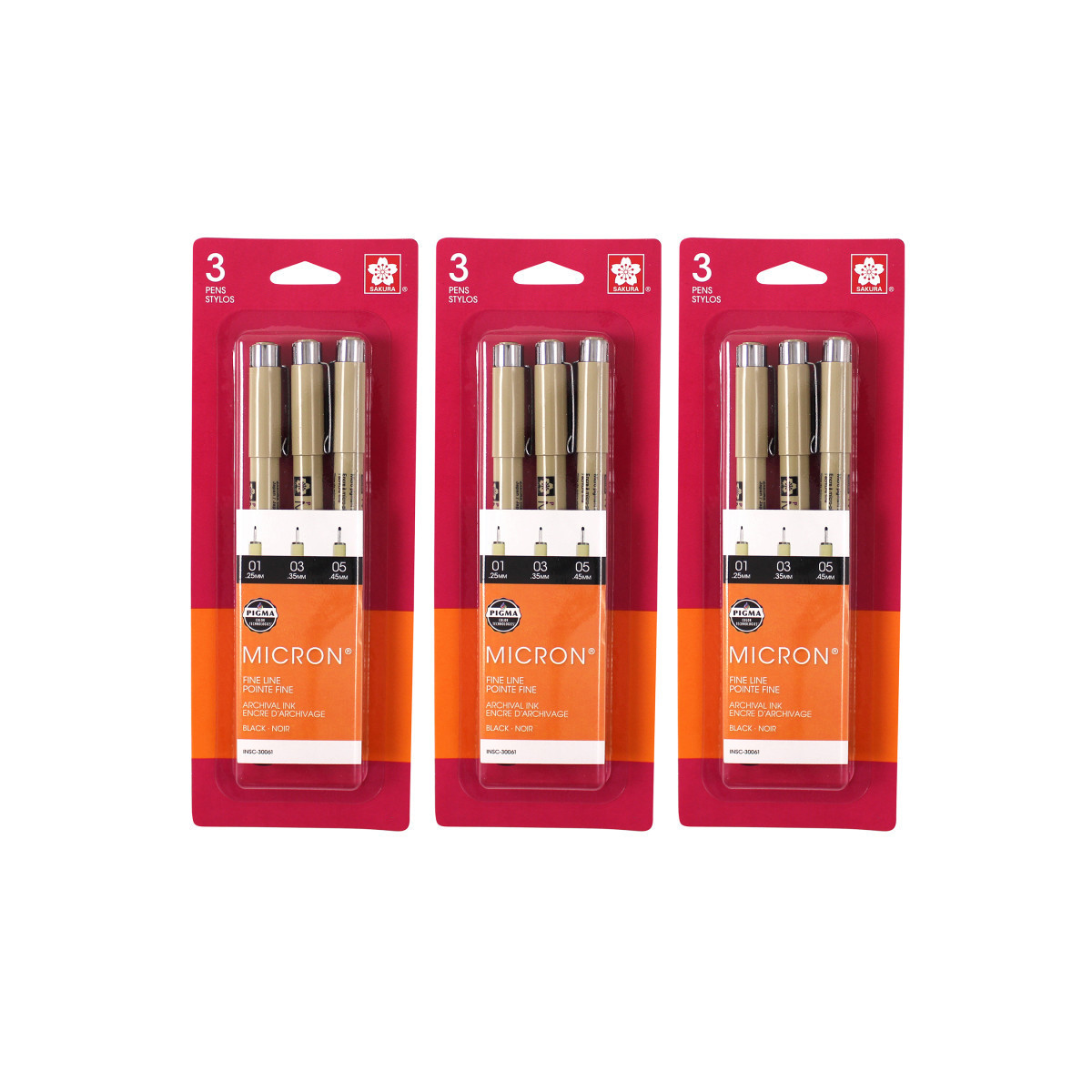 3 per pack in sizes 01, 03, 05, sold as 3 packs for a total of 9 pens.