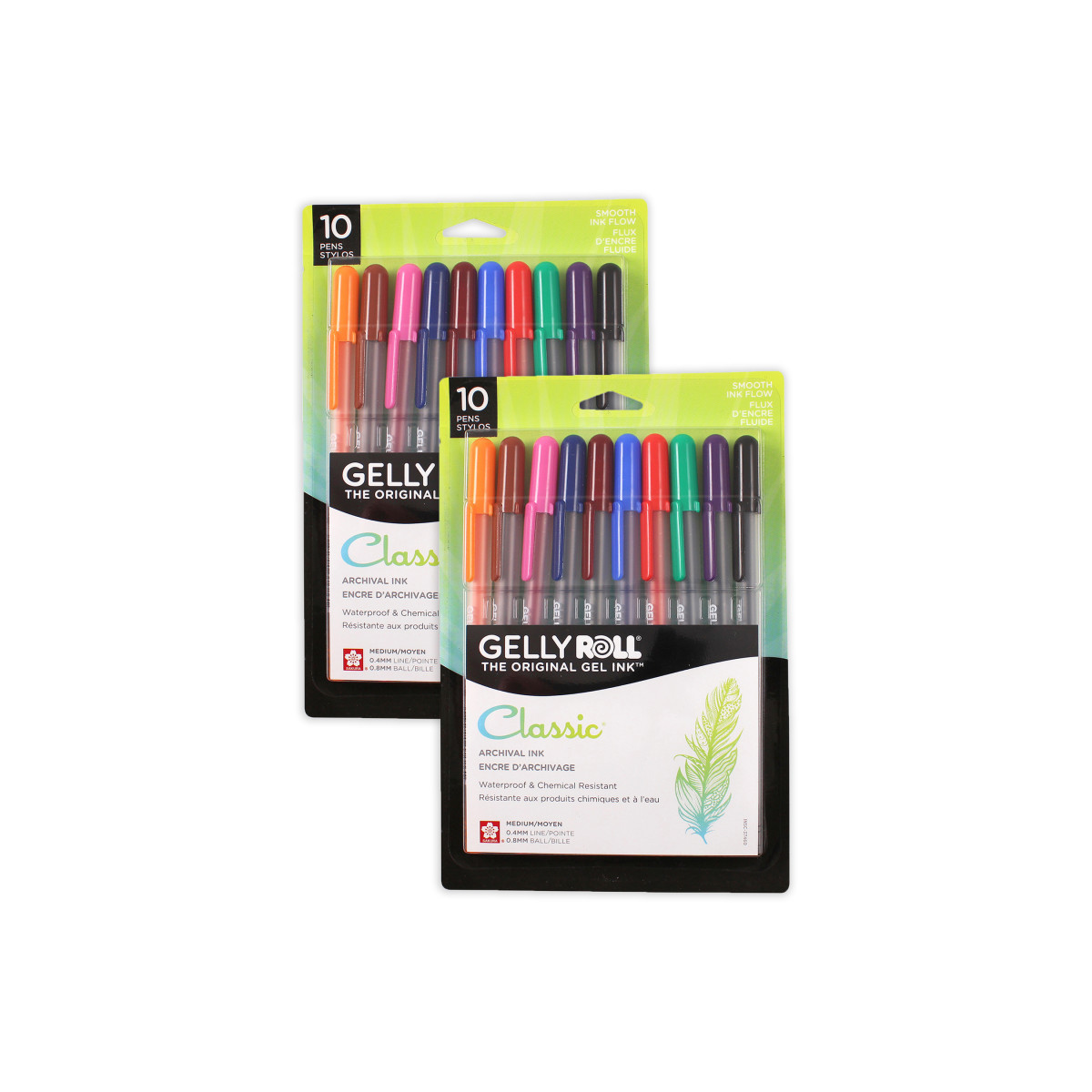 These creamy, colorful Gelly Roll® gel ink pens will be your favorite flavor for letting thoughts flow onto paper. This gel ink is archival, waterproof, fade resistant, ideal for wherever permanence is important. Each Gelly Roll pen pack contains 10 medium tip pens in assorted colors: Black, Blue, Red, Green, Brown, Purple, Orange, Royal Blue, Pink, Burgundy. Sold as 2 packs for a total of 20 pens.