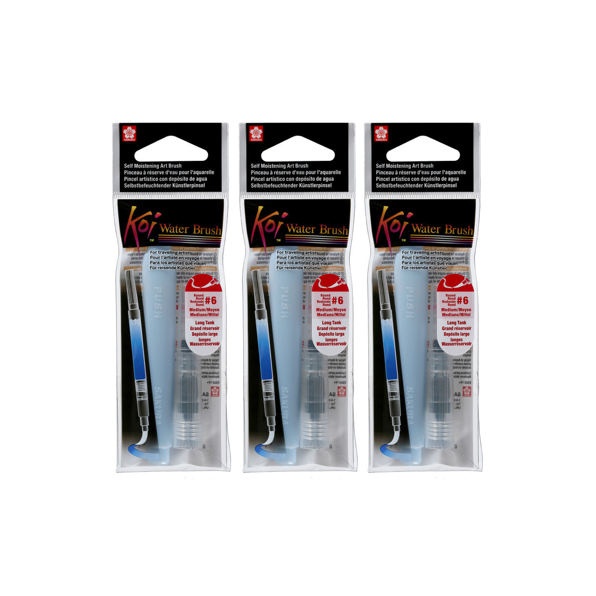 Work on your watercolors anywhere and at any time with the Koi Water Brush! Koi Water Brushes are designed for easy transportation and storage of water when you’re away from home or the studio. The brush separates into two parts: a fine flexible brush tip, and a barrel handle with a plug to carry water. This paint brush has a unique refillable water reservoir, including a stopper to prevent water from leaking when detaching the water brush. The comfortable grip is great for controlled blending, shading, and highlighting. Sold as a pack of 3.