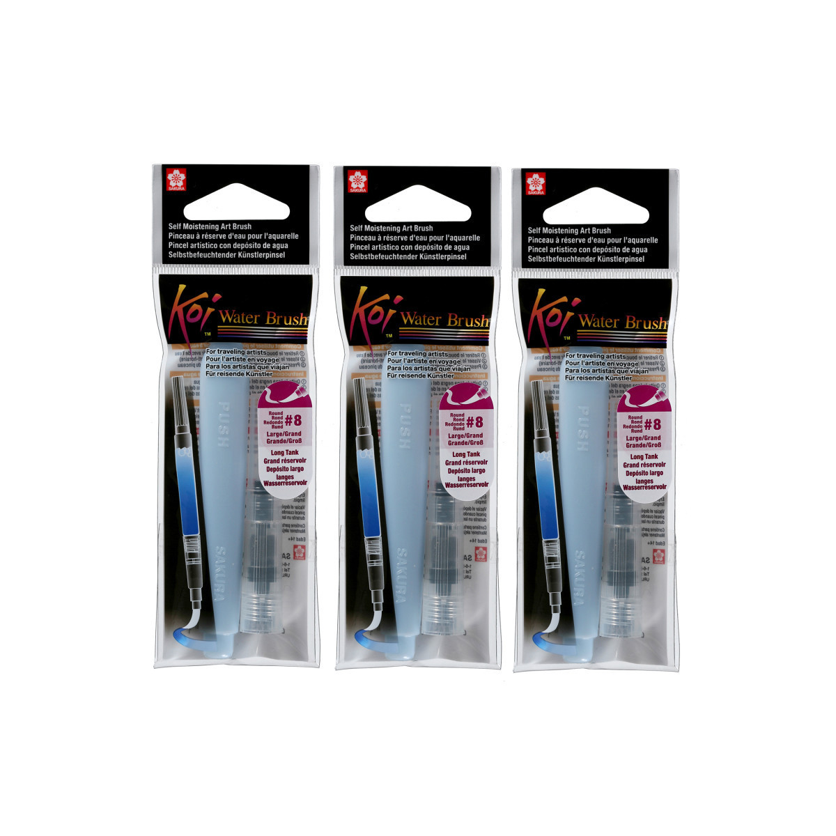 Work on your watercolors anywhere and at any time with the Koi Water Brush! Koi Water Brushes are designed for easy transportation and storage of water when you’re away from home or the studio. The brush separates into two parts: a fine flexible brush tip, and a barrel handle with a plug to carry water. This paint brush has a unique refillable water reservoir, including a stopper to prevent water from leaking when detaching the water brush. The comfortable grip is great for controlled blending, shading, and highlighting. Sold as a pack of 3.