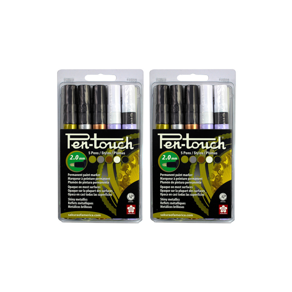Pen-Touch markers are perfect for marking and illustrating in bold colors. Pen-Touch writes on a wide variety of surfaces including cardstock, plastic, wood, glass, porcelain, paper and metal. The archival quality paint is chemically stable, waterproof, and fade resistant. The marker is also suitable for various industrial purposes, including manufacturing, quality control, security and theft prevention and construction. The marker features an aluminum barrel and a valve-action mechanism to ensure good flow of the highly pigmented ink. Writes on various surfaces, including steel & iron, sheet metal, glass & plexiglass, wood, ceramics, porcelain and plastics. Ideal for several industrial uses, including marking and identifying parts, pipes & tubing, sheet metal, wiring, construction assembly, manufacturing & fabrication processes. Adheres permanently to most surfaces. Removable from non-porous surfaces with alcohol or lacquer thinner. Each set includes 5 pens: Gold, Silver, White, Copper and Black. Sold as 2 sets for a total of 10 pens.