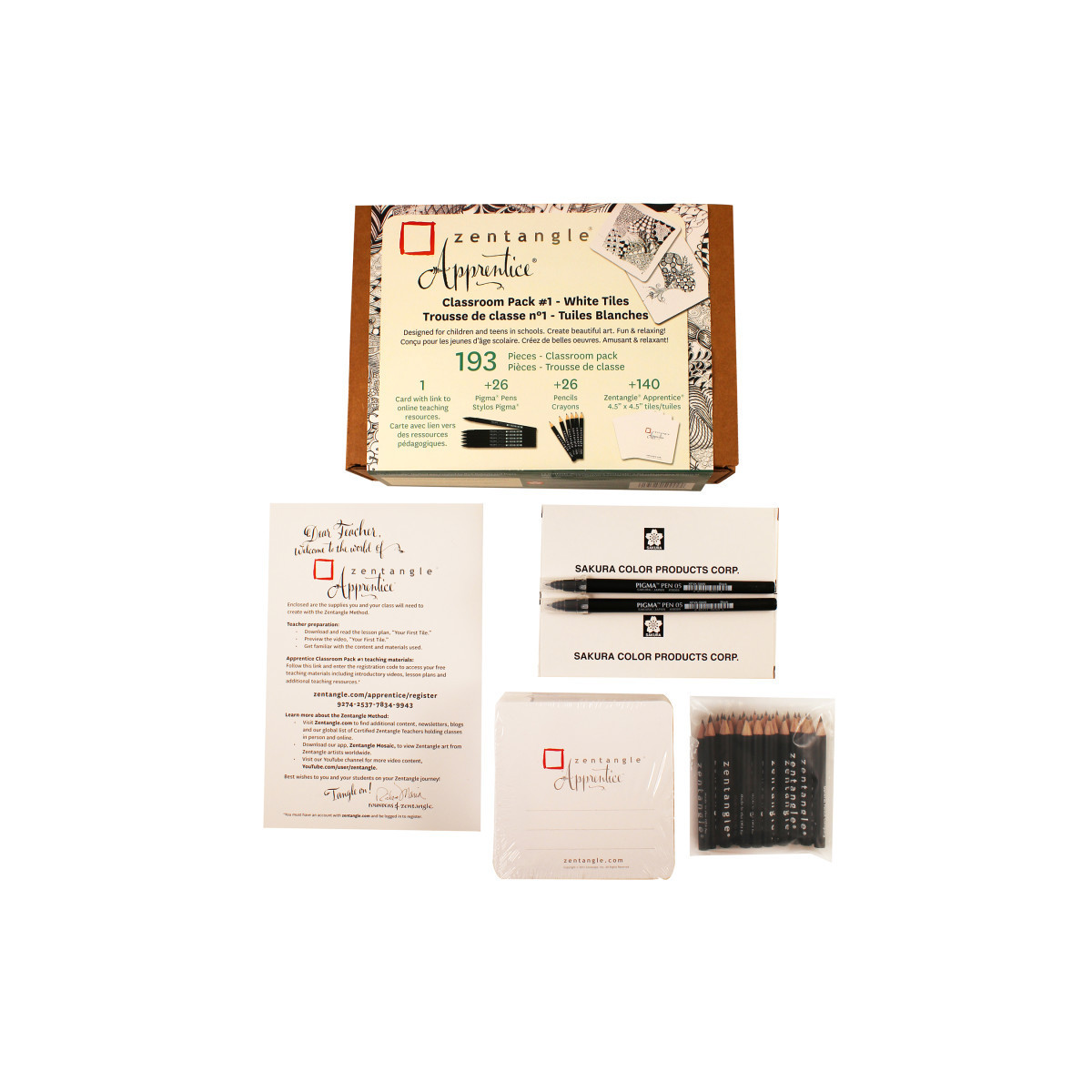 - Contains 1 instructional DVD, 26 Pigma pens, 26 pencils and 140 white Zentangle tiles