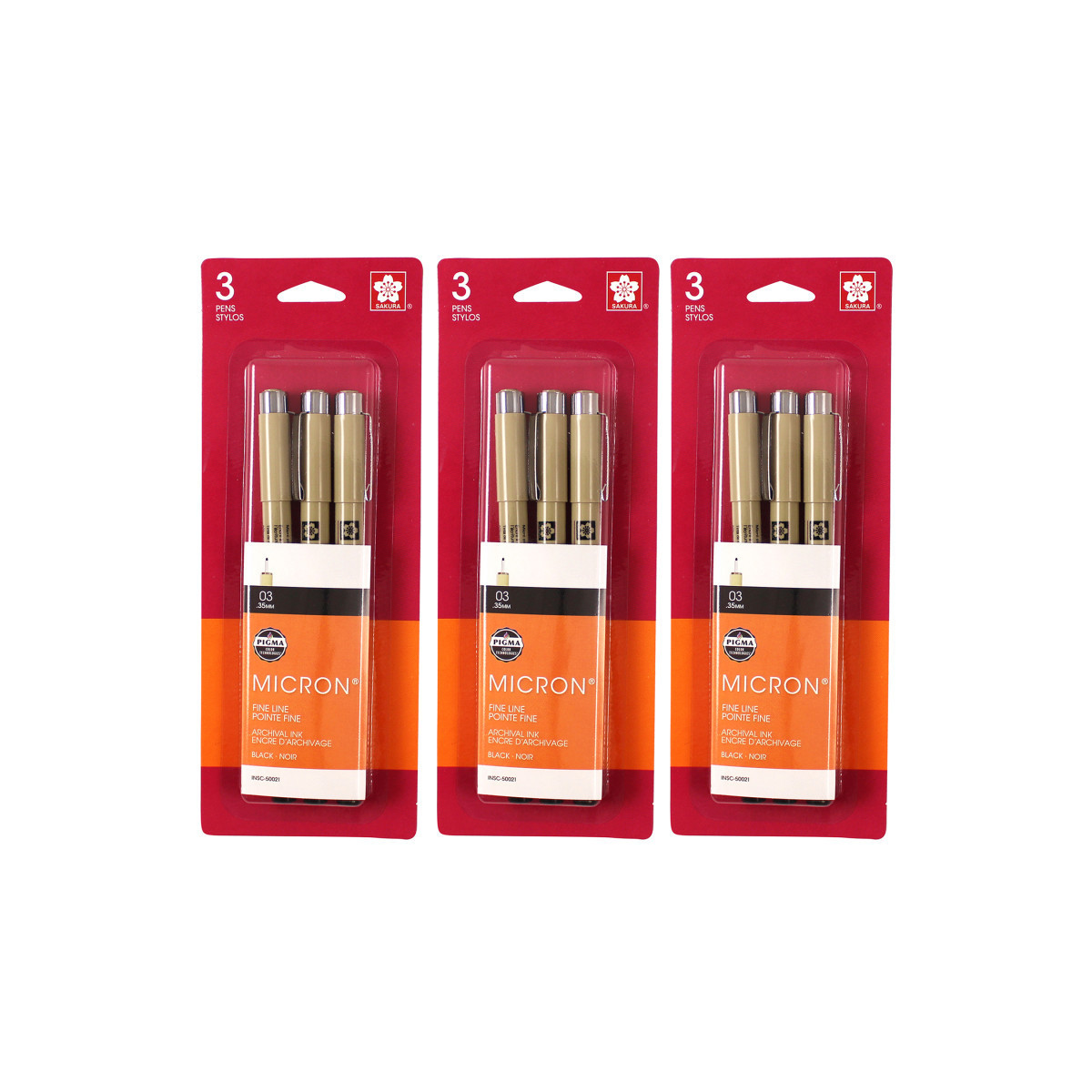 Pigma Micron pens are waterproof and permanent fineliners that are loyally used by designers, scientists, archivists, architects, Manga artists, cartoonists, illustrators and hobbyists. The fine nib makes this pen ideal for creating both technical and artistic drawings. The fineliners have a protective metal sleeve around the extended tip to give extra control and increased resilience when used with drawing aids such as rulers. This permanent, fade resistant, chemically stable, pigment-based ink will not bleed or run if liquids are spilled on or applied to the document after the ink has dried. Perfect for legal situations, Pigma ink is nearly impossible to alter on documents, in log books, or on checks. Architects, archivists, anthropologists, entomologists and laboratories depend on Pigma Micron for record keeping. Pigma Micron is the first disposable technical pen using archival pigmented ink. It does not smear, feather, or bleed through on most paper. Each set includes 3 size 03 pens. Sold as 3 sets for a total of 9 pens.