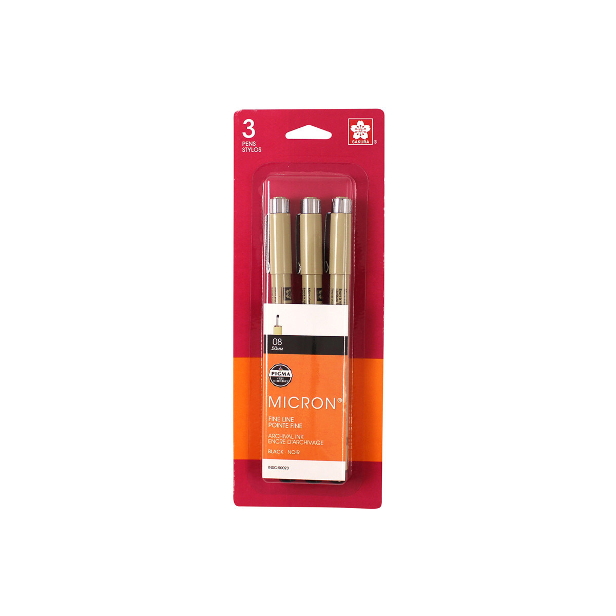 Pigma Micron pens are waterproof and permanent fineliners that are loyally used by designers, scientists, archivists, architects, Manga artists, cartoonists, illustrators and hobbyists. The fine nib makes this pen ideal for creating both technical and artistic drawings. The fineliners have a protective metal sleeve around the extended tip to give extra control and increased resilience when used with drawing aids such as rulers. This permanent, fade resistant, chemically stable, pigment-based ink will not bleed or run if liquids are spilled on or applied to the document after the ink has dried. Perfect for legal situations, Pigma ink is nearly impossible to alter on documents, in log books, or on checks. Architects, archivists, anthropologists, entomologists and laboratories depend on Pigma Micron for record keeping. Pigma Micron is the first disposable technical pen using archival pigmented ink. It does not smear, feather, or bleed through on most paper. Contains three size 08 pens.