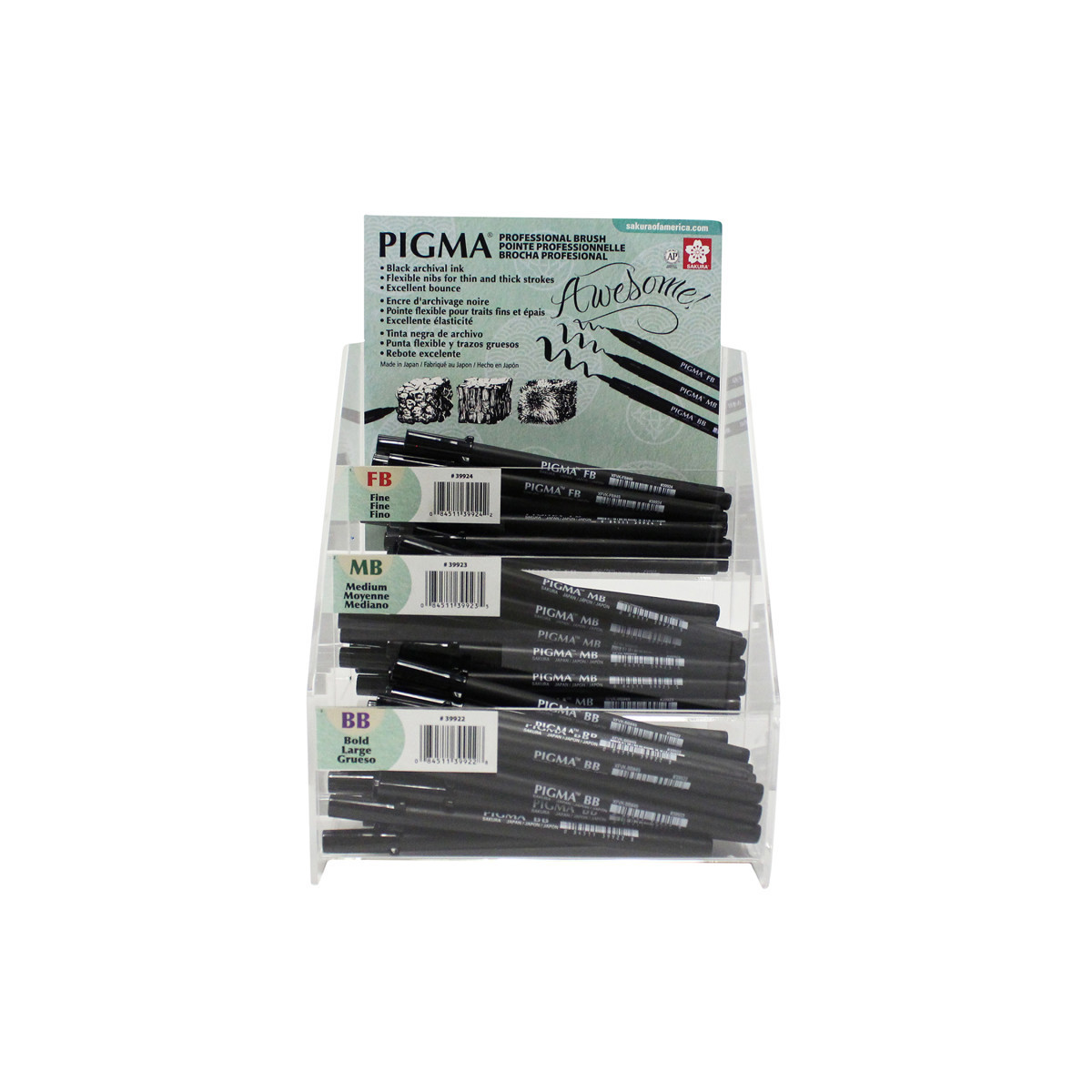 From super fine hairlines to big, bold strokes, the new Pigma Professional Brush series offers the ultimate in versatility. These durable brush nibs respond to instant changes in pressure or direction with a silky smooth, accurate and consistent ink flow. The deep black, archival quality Pigma® ink ensures the mark will last a lifetime. Artists who prefer brushes will appreciate the flexibility of a portable brush with continual ink flow, avoiding the need to dip the brush and carry messy inks. Manga and comic artists, illustrators, and lettering art professionals will enjoy the expressiveness of thick to thin strokes with ease and fluidity. The brush nibs were specially developed to provide fantastic bounce and memory over long periods of use. Package contains 24 each of Fine, Medium and Bold Professional Brush Pens.