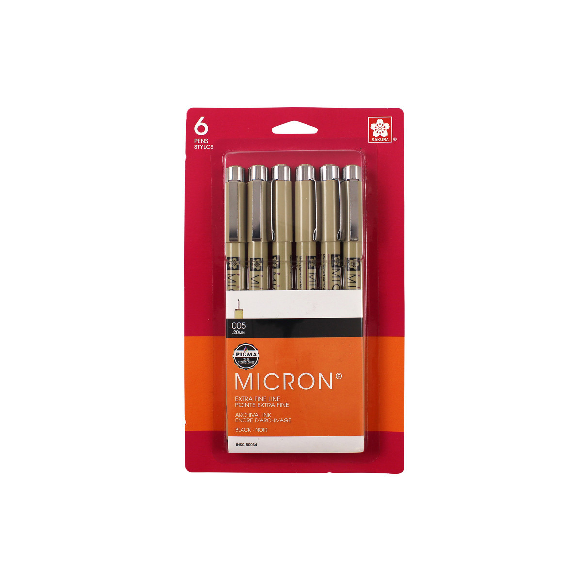 Pigma Micron pens are waterproof and permanent fineliners that are loyally used by designers, scientists, archivists, architects, Manga artists, cartoonists, illustrators and hobbyists. The fine nib makes this pen ideal for creating both technical and artistic drawings. The fineliners have a protective metal sleeve around the extended tip to give extra control and increased resilience when used with drawing aids such as rulers. This permanent, fade resistant, chemically stable, pigment-based ink will not bleed or run if liquids are spilled on or applied to the document after the ink has dried. Perfect for legal situations, Pigma ink is nearly impossible to alter on documents, in log books, or on checks. Architects, archivists, anthropologists, entomologists and laboratories depend on Pigma Micron for record keeping. Pigma Micron is the first disposable technical pen using archival pigmented ink. It does not smear, feather, or bleed through on most paper. Contains six size 005 pens.