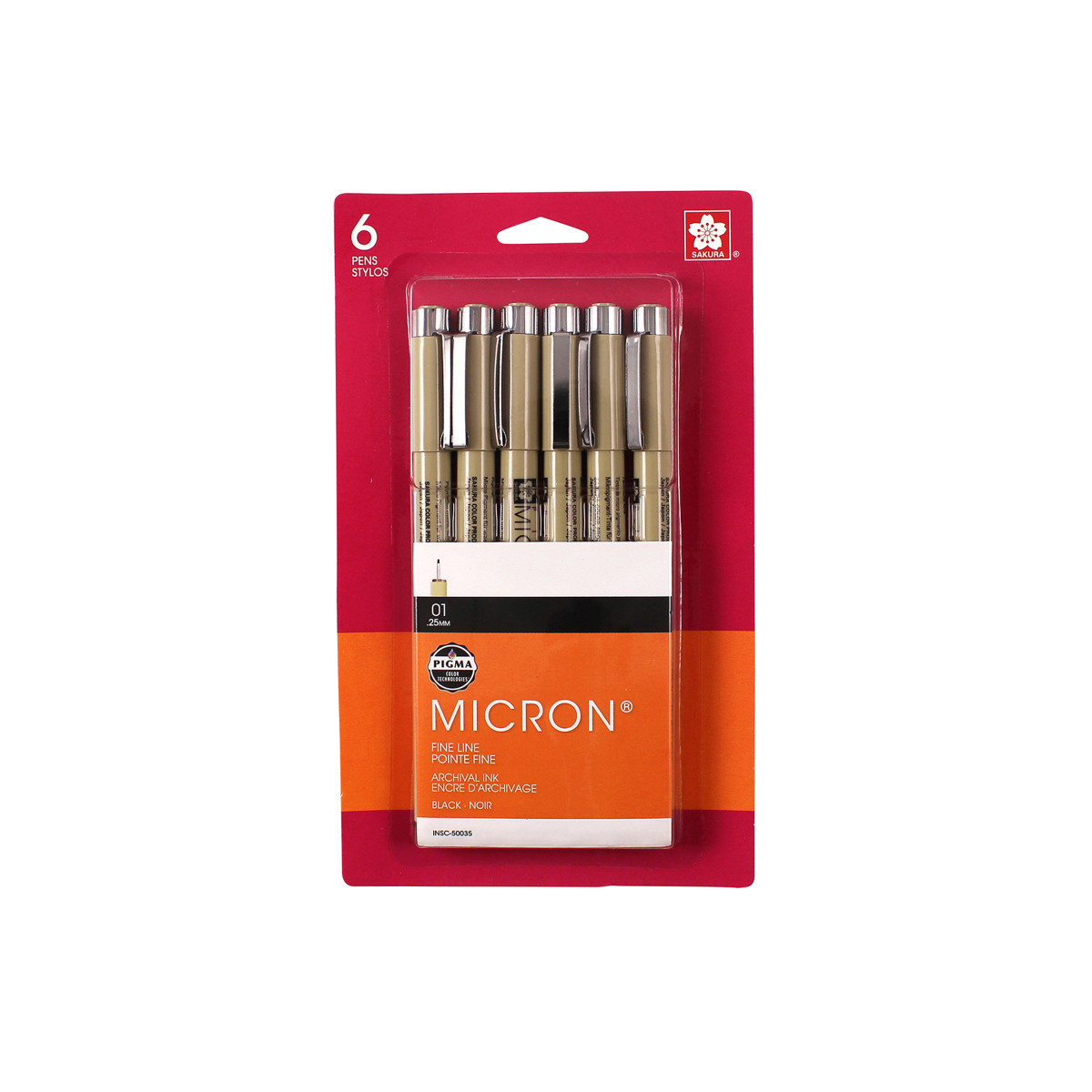 Pigma Micron pens are waterproof and permanent fineliners that are loyally used by designers, scientists, archivists, architects, Manga artists, cartoonists, illustrators and hobbyists. The fine nib makes this pen ideal for creating both technical and artistic drawings. The fineliners have a protective metal sleeve around the extended tip to give extra control and increased resilience when used with drawing aids such as rulers. This permanent, fade resistant, chemically stable, pigment-based ink will not bleed or run if liquids are spilled on or applied to the document after the ink has dried. Perfect for legal situations, Pigma ink is nearly impossible to alter on documents, in log books, or on checks. Architects, archivists, anthropologists, entomologists and laboratories depend on Pigma Micron for record keeping. Pigma Micron is the first disposable technical pen using archival pigmented ink. It does not smear, feather, or bleed through on most paper. Contains six size 01 pens.