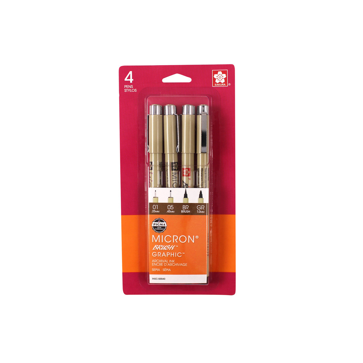 Pigma Micron pens are waterproof and permanent fineliners that are loyally used by designers, scientists, archivists, architects, Manga artists, cartoonists, illustrators and hobbyists. The fine nib makes this pen ideal for creating both technical and artistic drawings. The fineliners have a protective metal sleeve around the extended tip to give extra control and increased resilience when used with drawing aids such as rulers. This permanent, fade resistant, chemically stable, pigment-based ink will not bleed or run if liquids are spilled on or applied to the document after the ink has dried. Perfect for legal situations, Pigma ink is nearly impossible to alter on documents, in log books, or on checks. Architects, archivists, anthropologists, entomologists and laboratories depend on Pigma Micron for record keeping. Pigma Micron is the first disposable technical pen using archival pigmented ink. It does not smear, feather, or bleed through on most paper. Contains Pigma Micron, Brush and Graphic in Sepia: 1 each Brush; Micron 01; Micron 05; Graphic 1mm.