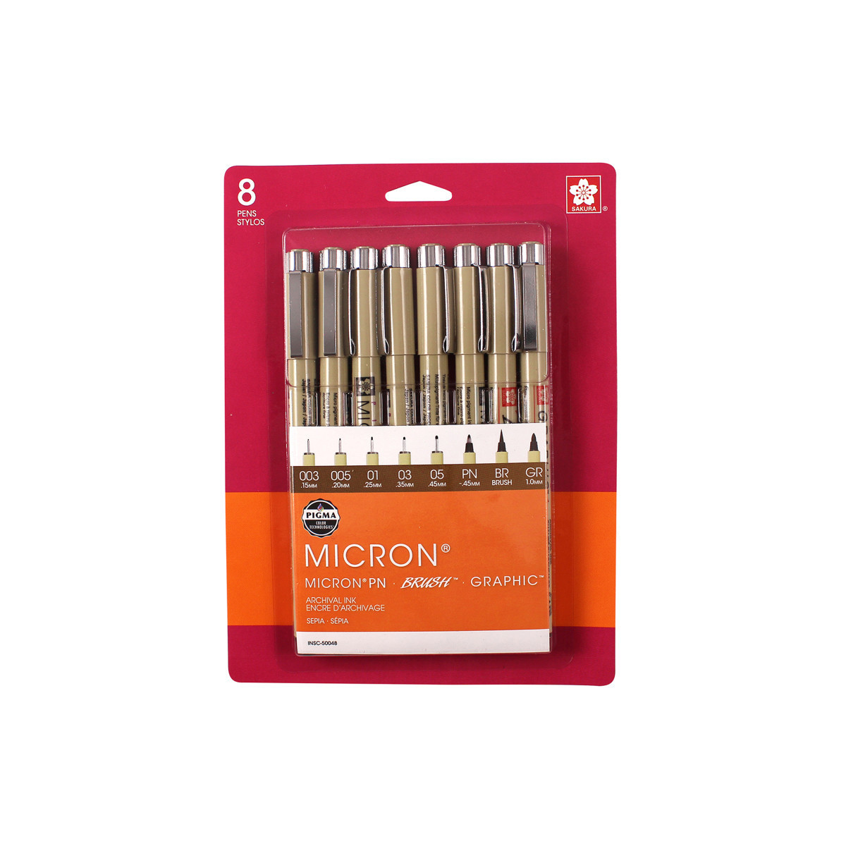 Pigma Micron pens are waterproof and permanent fineliners that are loyally used by designers, scientists, archivists, architects, Manga artists, cartoonists, illustrators and hobbyists. The fine nib makes this pen ideal for creating both technical and artistic drawings. The fineliners have a protective metal sleeve around the extended tip to give extra control and increased resilience when used with drawing aids such as rulers. This permanent, fade resistant, chemically stable, pigment-based ink will not bleed or run if liquids are spilled on or applied to the document after the ink has dried. Perfect for legal situations, Pigma ink is nearly impossible to alter on documents, in log books, or on checks. Architects, archivists, anthropologists, entomologists and laboratories depend on Pigma Micron for record keeping. Pigma Micron is the first disposable technical pen using archival pigmented ink. It does not smear, feather, or bleed through on most paper. Contains sizes 005, 01, 02, 03, 05, 08, 1mm and Brush.