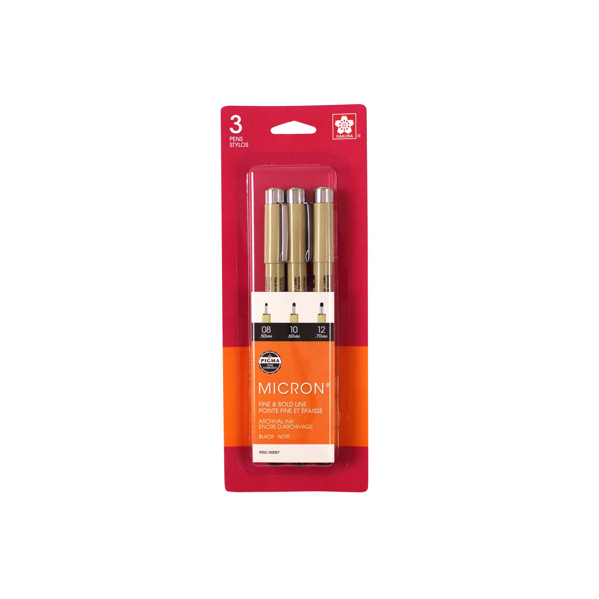 Pigma Micron pens are waterproof and permanent fineliners that are loyally used by designers, scientists, archivists, architects, Manga artists, cartoonists, illustrators and hobbyists. The fine nib makes this pen ideal for creating both technical and artistic drawings. The fineliners have a protective metal sleeve around the extended tip to give extra control and increased resilience when used with drawing aids such as rulers. This permanent, fade resistant, chemically stable, pigment-based ink will not bleed or run if liquids are spilled on or applied to the document after the ink has dried. Perfect for legal situations, Pigma ink is nearly impossible to alter on documents, in log books, or on checks. Architects, archivists, anthropologists, entomologists and laboratories depend on Pigma Micron for record keeping. Pigma Micron is the first disposable technical pen using archival pigmented ink. It does not smear, feather, or bleed through on most paper. Contains sizes 08, 10 and 12.
