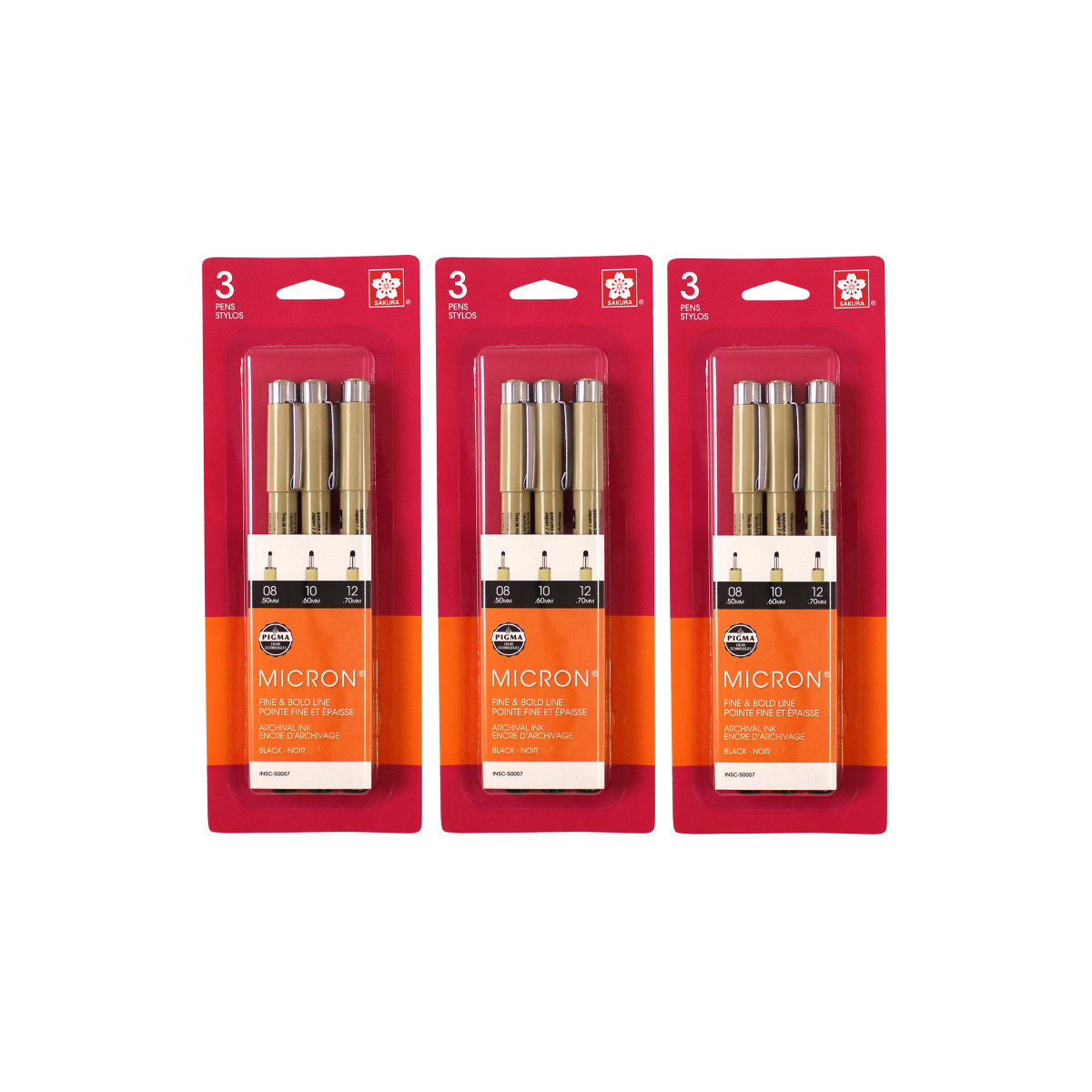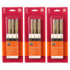 Pigma Micron pens are waterproof and permanent fineliners that are loyally used by designers, scientists, archivists, architects, Manga artists, cartoonists, illustrators and hobbyists. The fine nib makes this pen ideal for creating both technical and artistic drawings. The fineliners have a protective metal sleeve around the extended tip to give extra control and increased resilience when used with drawing aids such as rulers. This permanent, fade resistant, chemically stable, pigment-based ink will not bleed or run if liquids are spilled on or applied to the document after the ink has dried. Perfect for legal situations, Pigma ink is nearly impossible to alter on documents, in log books, or on checks. Architects, archivists, anthropologists, entomologists and laboratories depend on Pigma Micron for record keeping. Pigma Micron is the first disposable technical pen using archival pigmented ink. It does not smear, feather, or bleed through on most paper. Each pack includes 3 pens in sizes 08, 10 and 12. Sold as 3 sets for a total of 9 pens.