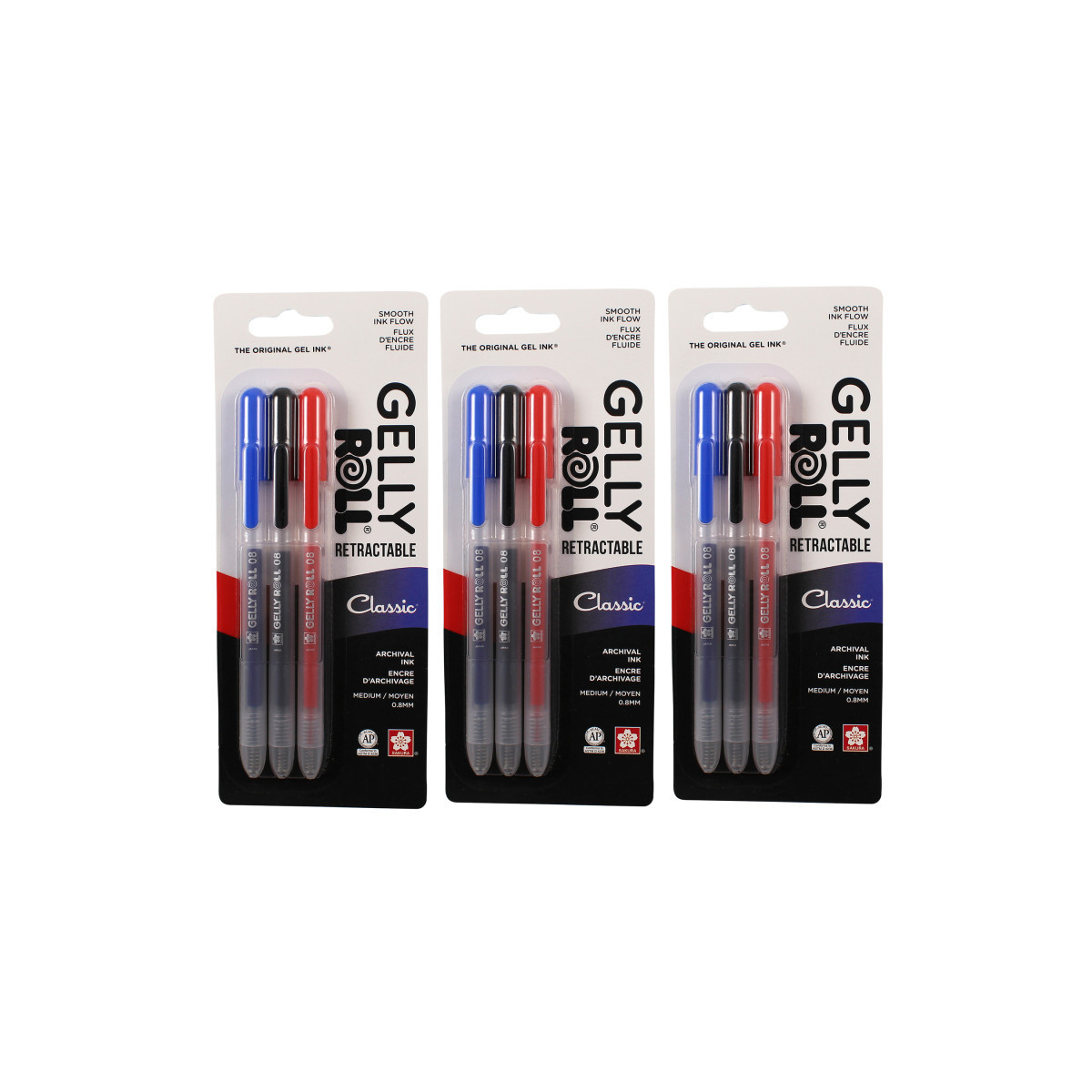 These creamy, colorful Gelly Roll® gel ink pens will be your favorite flavor for letting thoughts flow onto paper. Our shiny gel ink writes on matte or glossy papers, and comes in an 08 medium tip size for smooth gel ink flow. Our Archival Ink stays put! Gelly Roll Retractable is waterproof, chemical & fade resistant, bleed-free, and ph-neutral. Each Gelly Roll pen set contains 3 medium tip pens in Black, Blue and Red. Sold as 3 sets for a total of 9 pens.