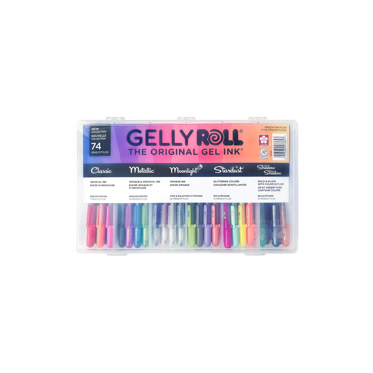 From the makers of The Original Gel Ink®, our super smooth Gelly Roll, now in convenient retractable. Create something special with unlimited possibilities for creative fun, innovative colors, and ink styles that go from work to play with ease. Super smooth Classic ink is perfect for notes, lists, drawing, and beyond. Our shiny gel ink writes on matte or glossy papers, and comes in an 08 medium tip size for smooth gel ink flow. Our Archival Ink stays put! Gelly Roll Retractable is waterproof, chemical & fade resistant, bleed-free, and ph-neutral. This set contains 11 Classic, 14 Metallic, 11 Moonlight 06, 15 Moonlight 10, 13 Stardust and 10 Gold & Silver Shadow.