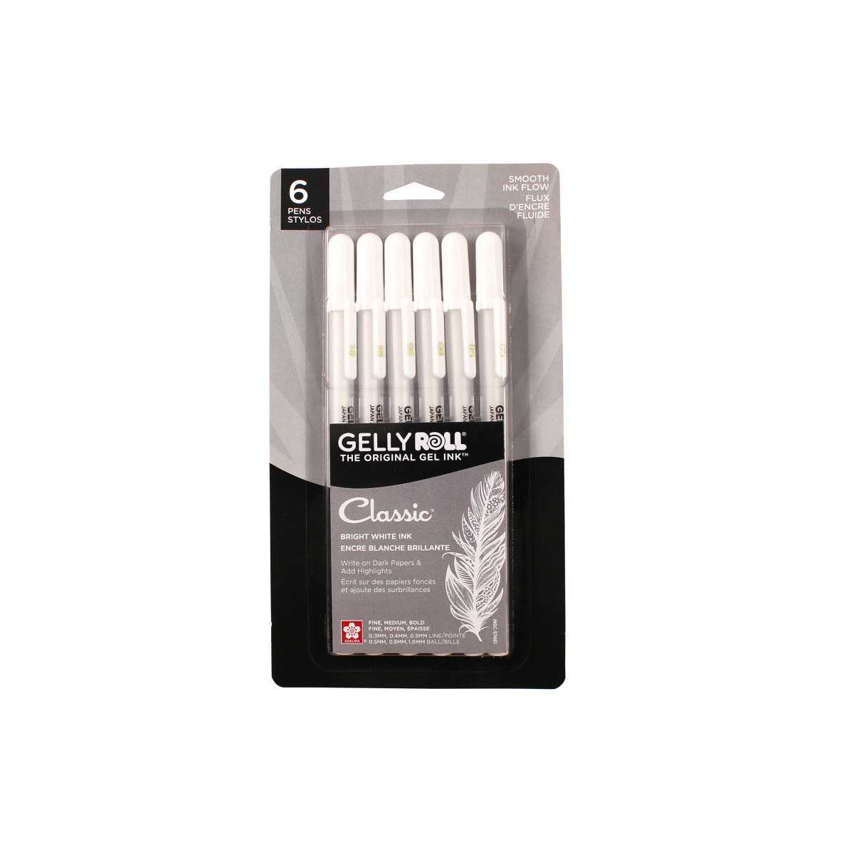Sakura Retractable Gelly Roll Pens: The original gel ink, reimagined in retractable, so you can infuse fun, sparkle, and shine into work, art, and play; great as bullet journal pens. The opaque white ink stands out on dark and colored papers and makes highlights pop in illustrations and comics. Use it for hand lettering accents, party crafts, layered on top of colors for mixed media and bright highlights in tonal drawings. This white pen pack contains 6 pens, including 2 pens of each size: 05 Fine, 08 Medium, and 10 Bold point sizes.