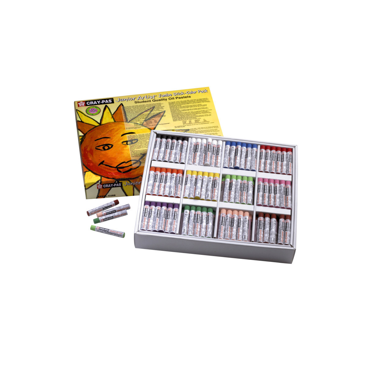 Invented in 1921, Sakura is the original inventor of oil pastels. Cray-Pas Junior Artist provides beautiful and blendable color for young hands. The best art curriculums nationwide use Cray-Pas to teach and practice art introductory techniques. Cray-Pas oil pastels can create oil paint effects, will not peel, crack or flake, are easily blendable, and are safe for children. The round shape of Cray-Pas Junior Artist is easy to hold, and are great for drawing, lettering, scratch art, and long lasting sidewalk art. A special chubbie size stick of Cray-Pas Junior is also available for little hands to grasp. Cray-Pas are excellent on paper, cardboard, and canvas. 24 each of 12 colors for 288 pieces total.