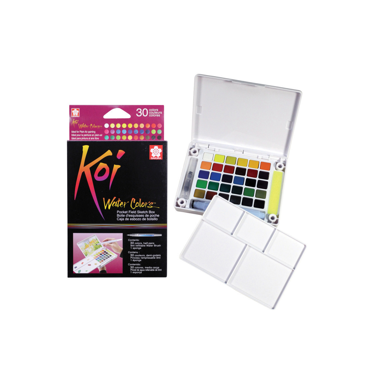Koi Water Colors are fun and vivid watercolor paints to illustrate, decorate and create art with! This compact kit contains 30 vibrant watercolors and includes a mixing palette in the lid of the box, a sponge and a Koi Water Brush (brush with water tank). Koi's rich color assortment offers the choice to create bold hues or soft and subtle shades. Keep this small set close by in your studio for a quick splash of color and to create deep washes for backgrounds. Or bring it along to create portraits and plein-air landscapes in the outdoors. This pocket-sized box is also great for adding color to comics, illustrations, and lettering projects.