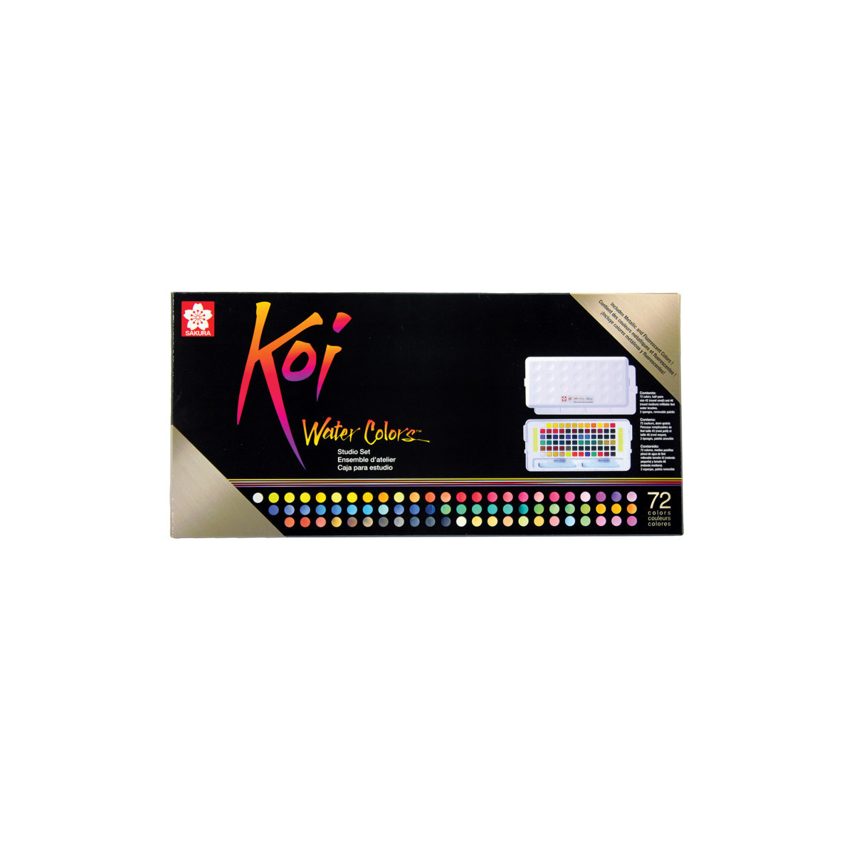 Koi Water Colors are fun and vivid watercolor paints to illustrate, decorate and create art with! This compact kit contains 72 vibrant watercolors and includes a mixing palette in the lid of the box, a sponge and a Koi Water Brush (brush with water tank). Koi's rich color assortment offers the choice to create bold hues or soft and subtle shades. Keep this small set close by in your studio for a quick splash of color and to create deep washes for backgrounds. Or bring it along to create portraits and plein-air landscapes in the outdoors. This pocket-sized box is also great for adding color to comics, illustrations, and lettering projects.